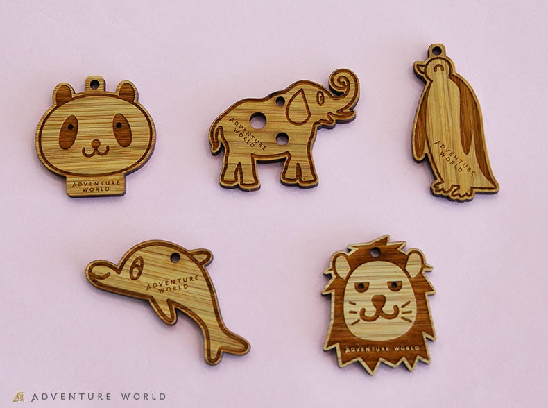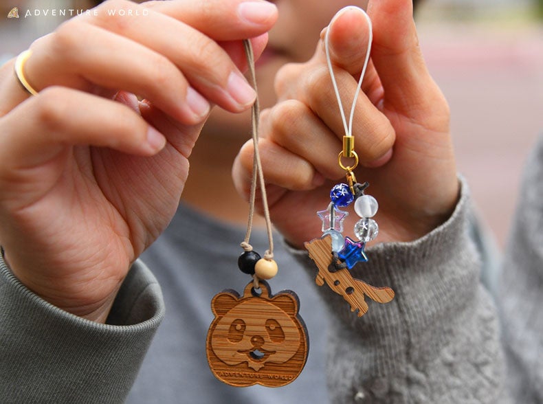 竹の集成材でできた動物のチャームに紐やビーズを通してオリジナルのキーホルダーを作る体験です。