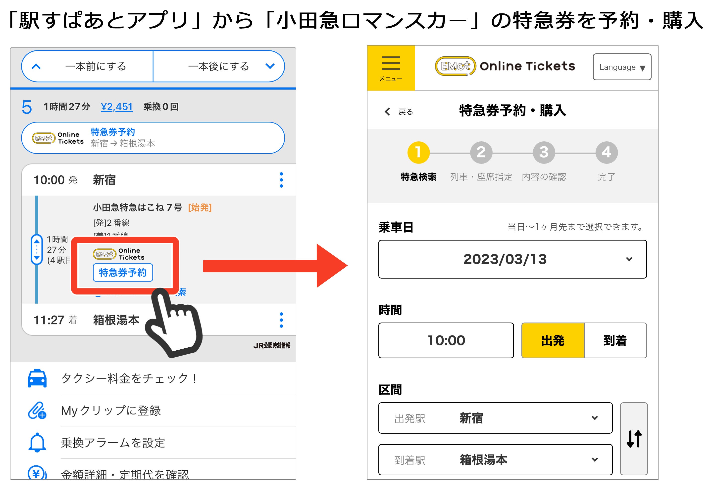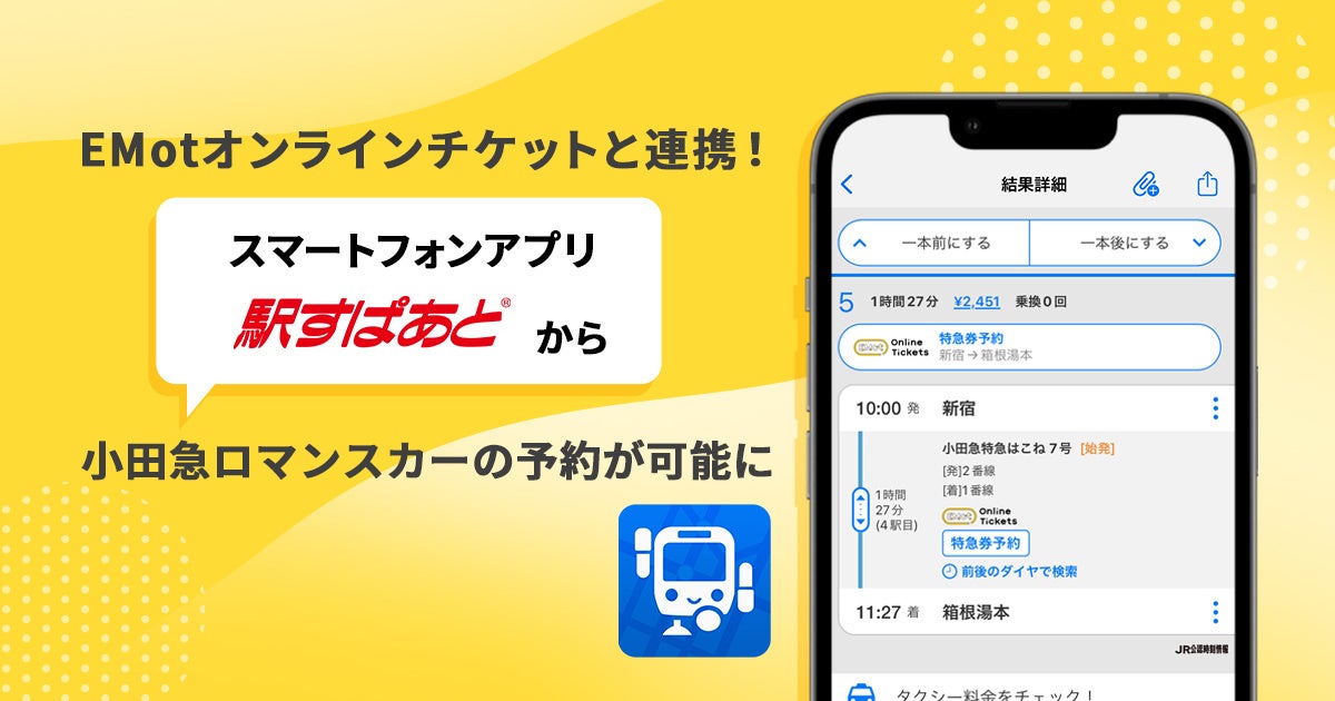 経路検索サービス「駅すぱあと」を提供する株式会社ヴァル研究所(本社:東京都杉並区、代表取締役:菊池 宗史、以下「ヴァル研究所」)は、「駅すぱあとアプリ(iOS版/Android版)」(以下「駅すぱあとアプリ」)と、小田急電鉄株式会社(本社:東京都渋谷区、取締役社長:星野 晃司、以下「小田急電鉄」)が提供するデジタルチケットサービス「EMotオンラインチケット」との連携(以下、本連携)を2023年3月22日(水)より開始しました。
