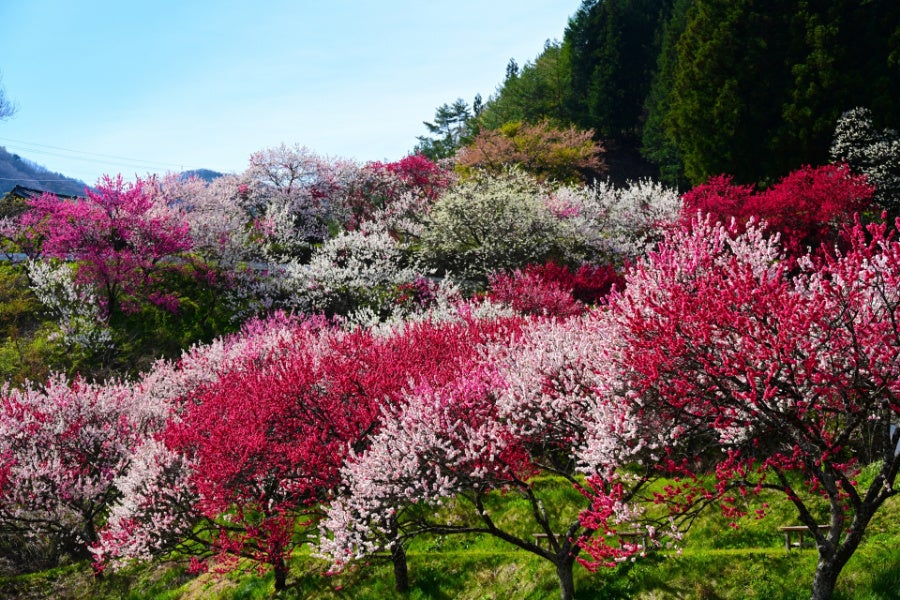 阿智村エリアでは一帯がこの美しい花桃が咲き誇る桃源郷となり、他の場所では見る事の出来ない美しい春の里山へと変化します。赤・白・ピンク3色に咲き誇る景色は圧巻です。桜とはまた違う鮮やかなグラデーションの花々を楽しめます。