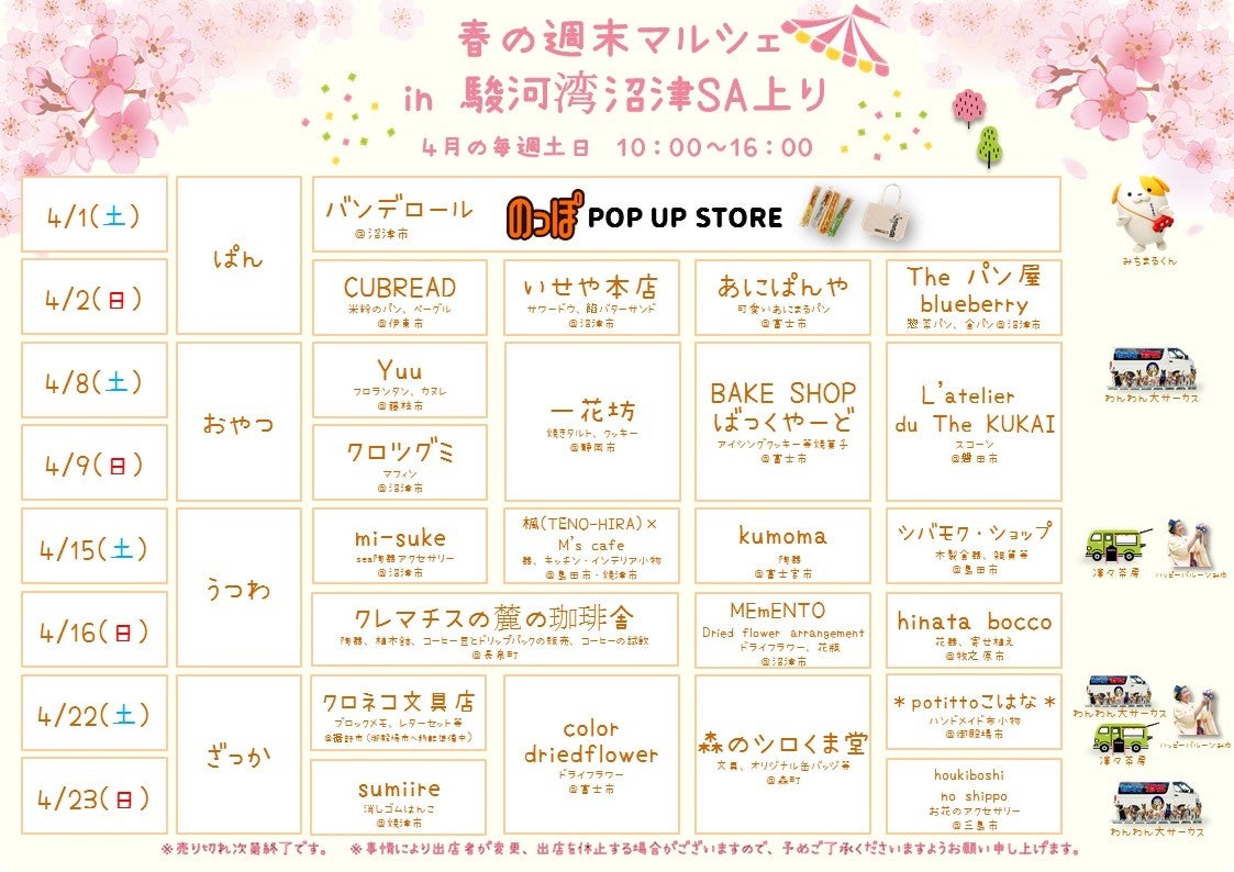 4月の週末は、ぜひNEOPASA駿河湾沼津(上り)にお越しいただき、ここでしか出会えない人・モノとの出会いをお楽しみください。