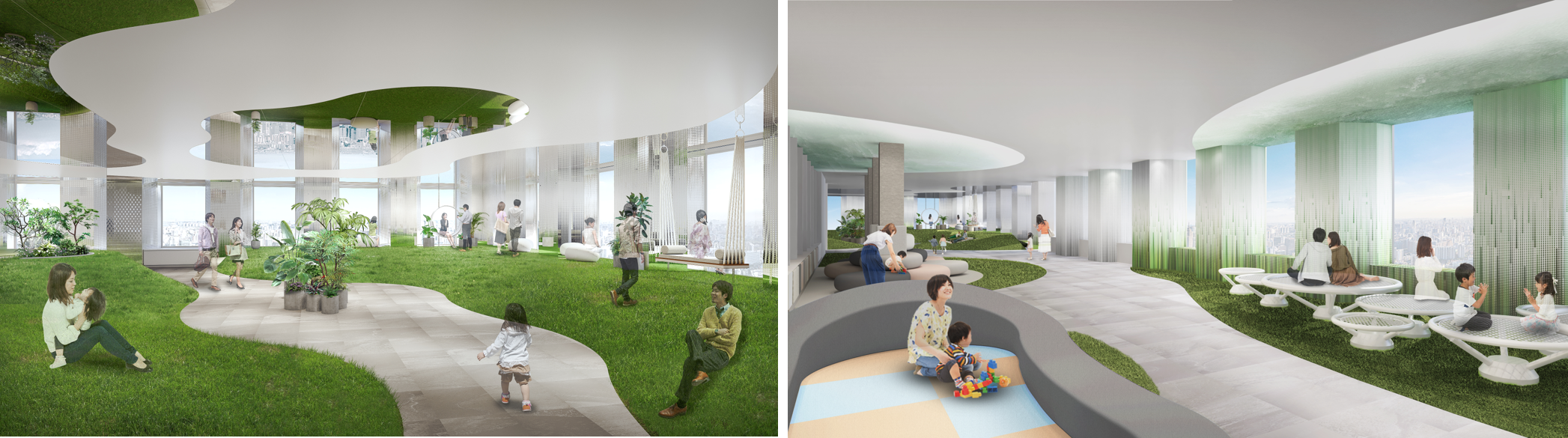植栽や人工芝を取り入れ、空と緑に囲まれた開放的な空間が広がるエリア