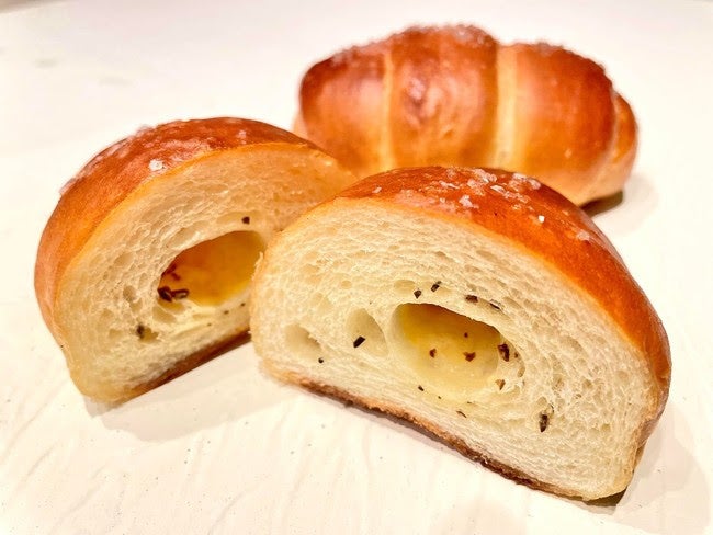 ビアンケットトリュフを生地の中に巻き込み、2012年に英国王室御用達の塩としても認定された、海水のみを原材料とする伝統的な製塩方法で作られる「マルドン シーソルト」を加え、焼き上がりにトリュフオイルを塗って仕上げたロールパン。 シーソルトがトリュフの豊かな香りを引き立て、味わいにも深みを出します。また、外側は香ばしく、中はもっちりふんわりとした生地の食感も絶品。贅を尽くした味わいをお愉しみいただけます。