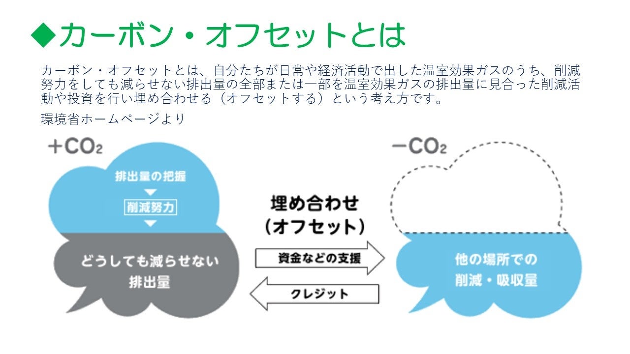 カーボン・オフセットとは、自分たちが日常や経済活動で出した温室効果ガスのうち、削減努力をしても減らせない排出量の全部または一部を温室効果ガスの排出量に見合った削減活動や投資を行い埋め合わせる(オフセットする)という考え方です。
