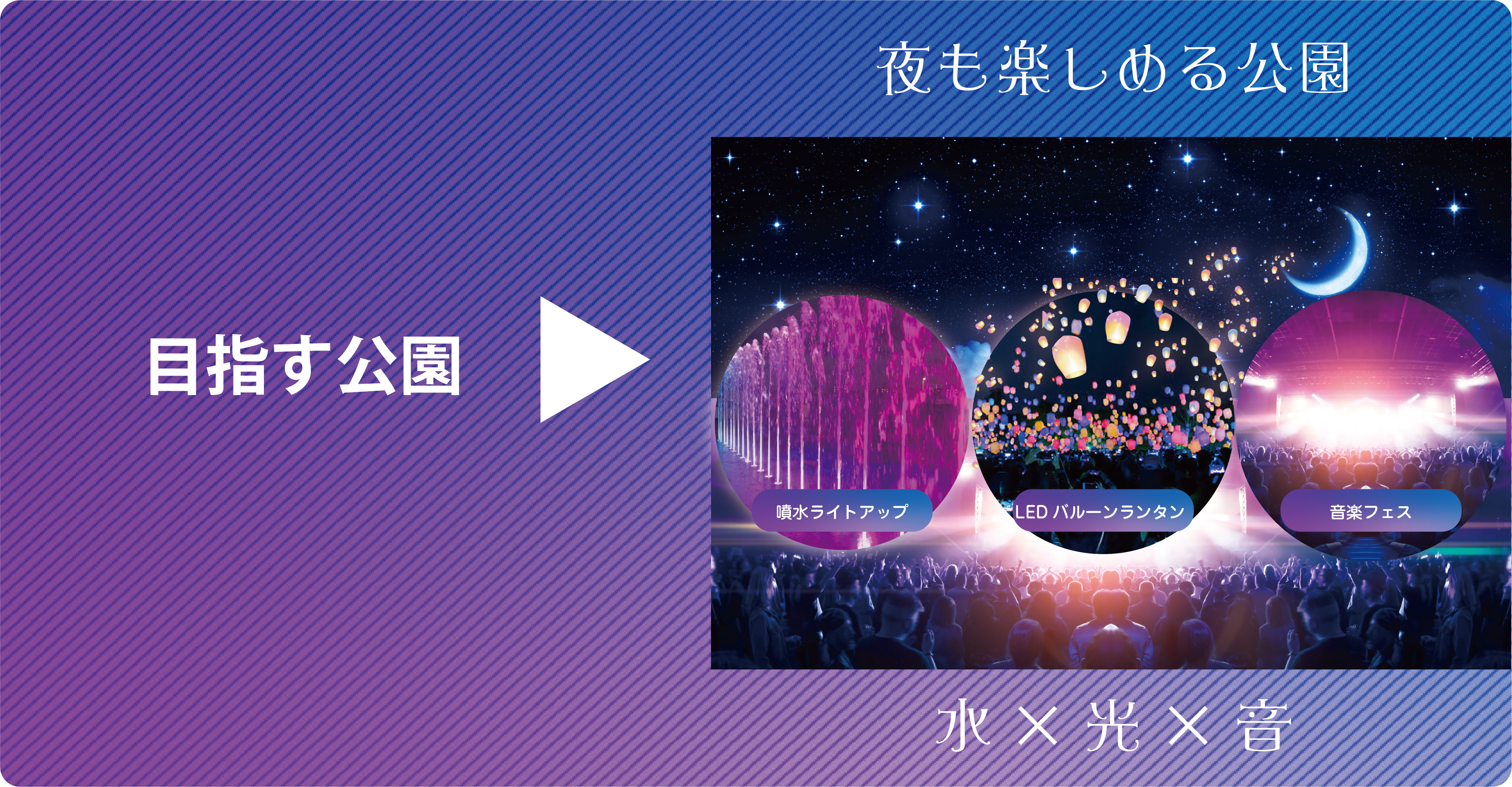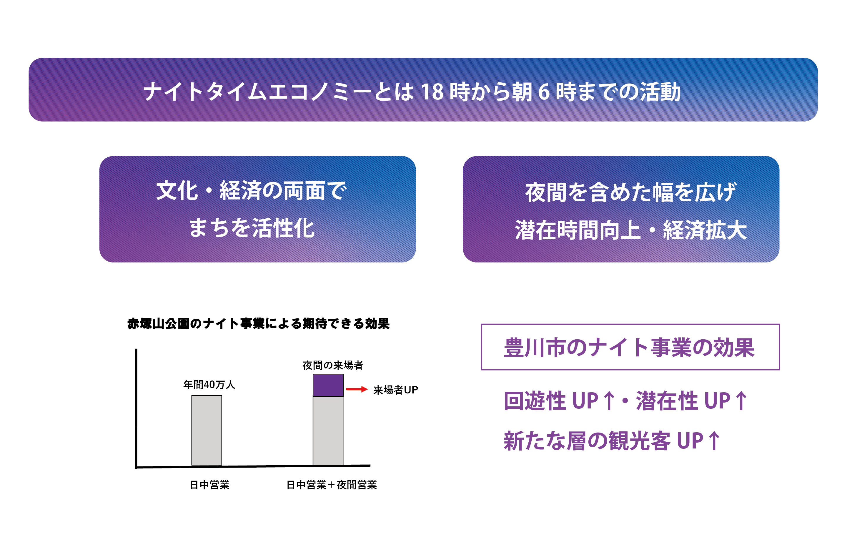 リニューアル後も持続的に来場者を増やすための仕組みづくりとして、近年着⽬されている経済を2回転させるナイトタイムエコノミーの観点と、⾚塚⼭公園の今ある特徴を⽣かした「夜の公園の新たな在り⽅のモデル事業」を提案するイベントを開催し、将来的に⾚塚⼭公園の ナイトタイムの利活⽤による地域活性化につなげて参ります。