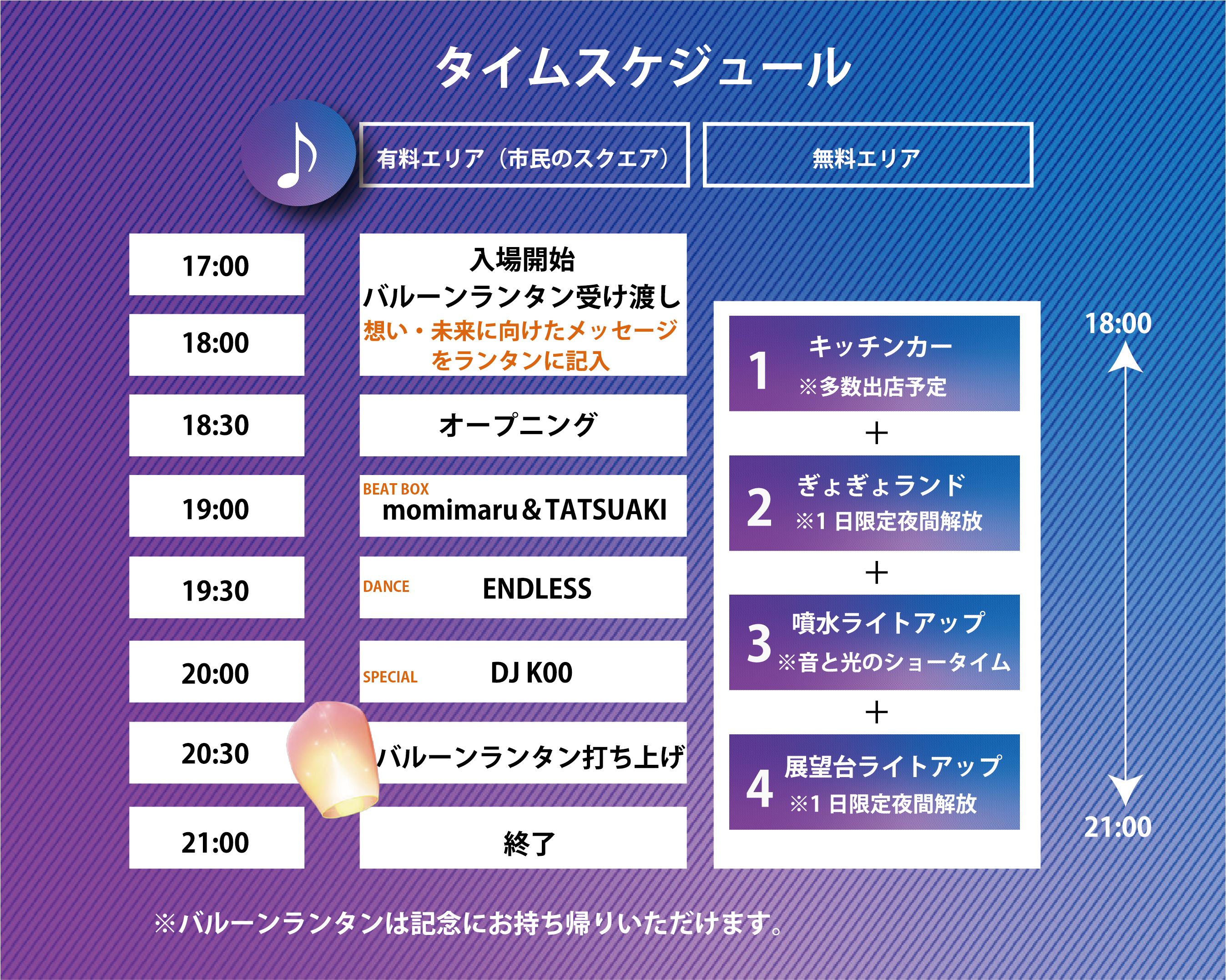DJ KOOさんを始めとするスペシャルゲストをお招きし、⾳楽やダンスを通して会場全体に⼀体感が⽣まれます。フィナレーではLEDバルーンランタンを⼀⻫に打ち上げます。
