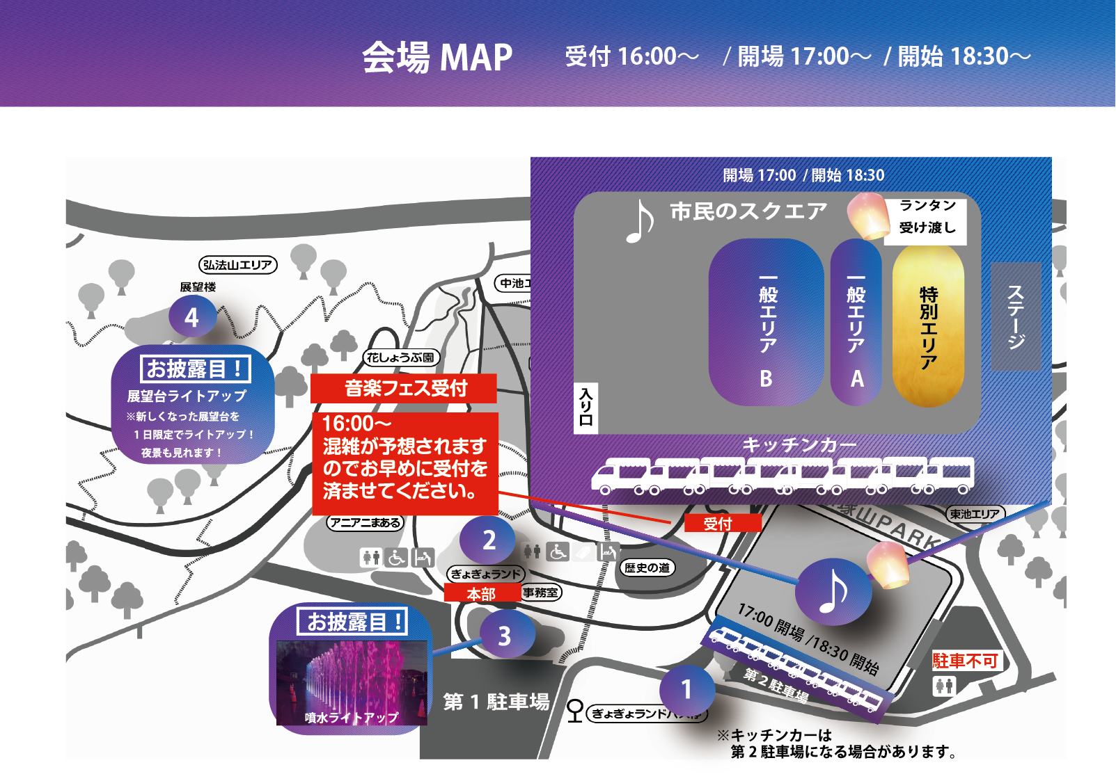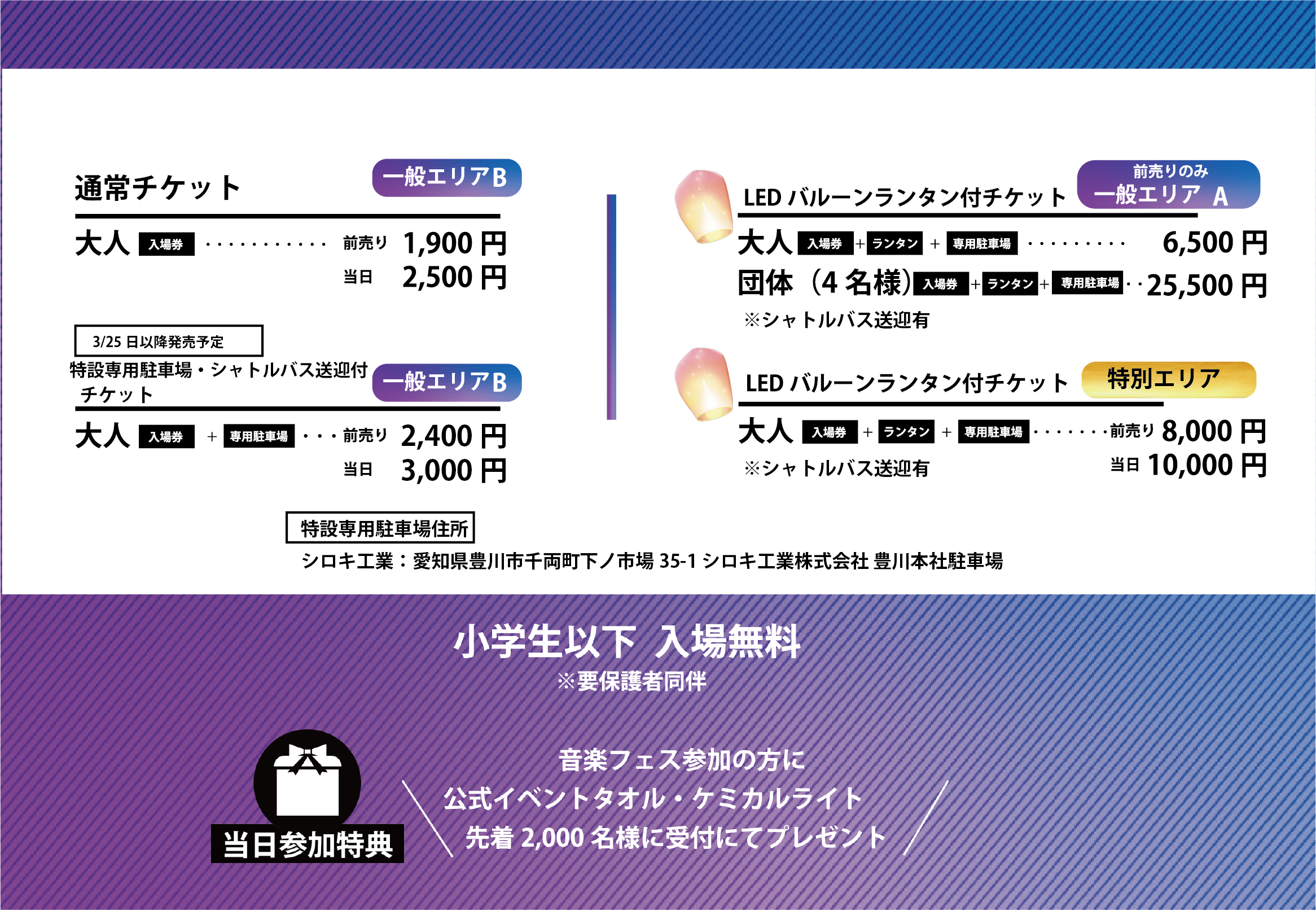 ※特別エリア、一般Aエリア、特設専用駐⾞場付チケット購入者のみ駐車可