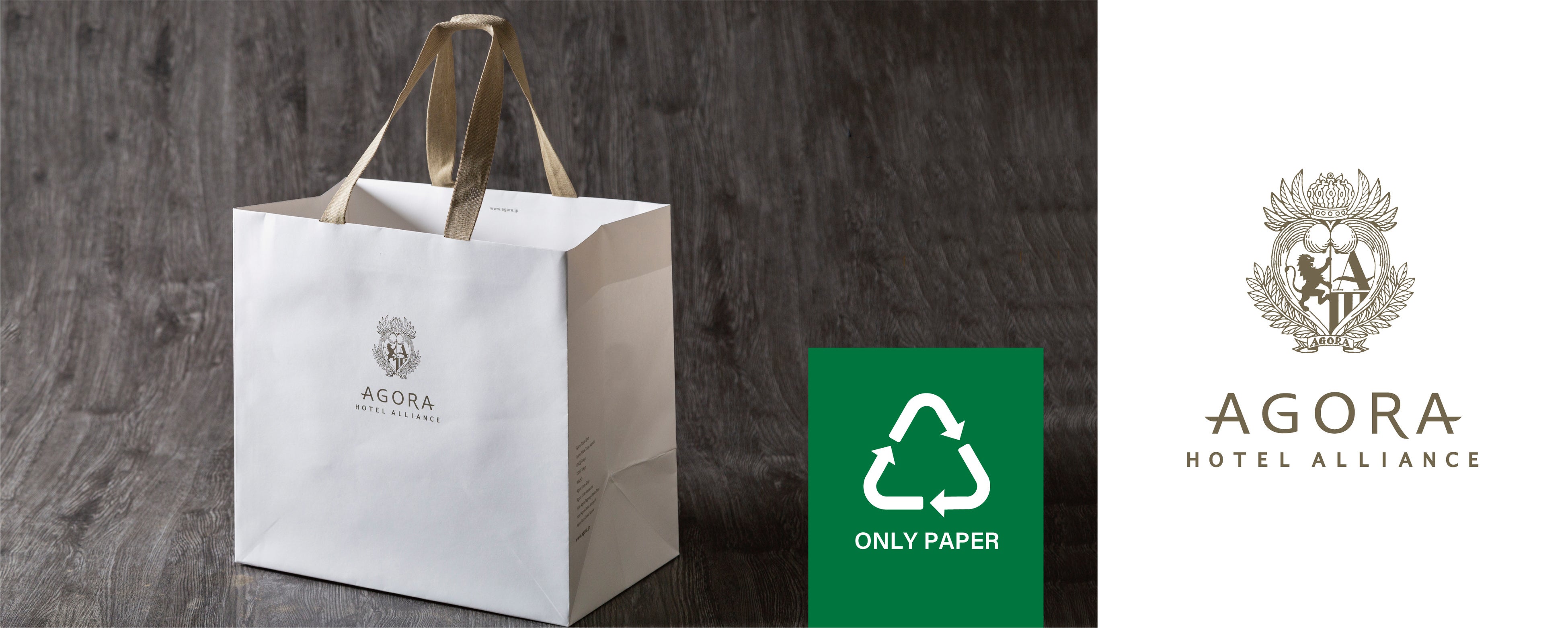 アゴーラ ホテル アライアンスでは、10年ぶりに紙袋のデザインを一新し、100%リサイクル可能な紙袋として循環型社会を目指します。新しいデザインとして、プロダクトに考慮し、シンプルなデザインで機能性を重視しました。白を基調とした幅の長いデザインで、持ち手の紐は紙を高密度に編んで作られており、十分な強度もあります。布製の紐のようにしなやかで優しい手触りは、見た目も質感も高級感あるモダンでシンプルな印象です。