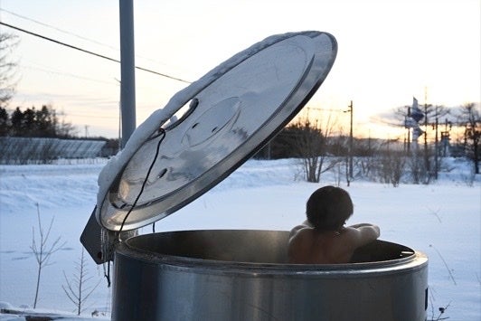 水風呂には1200Lの酪農用ミルクタンクを使用。日本一の透明度を誇る摩周湖や日本最大のカルデラ湖である屈斜路湖など、豊かな水資源を有する弟子屈町の水を贅沢にご堪能いただけます。