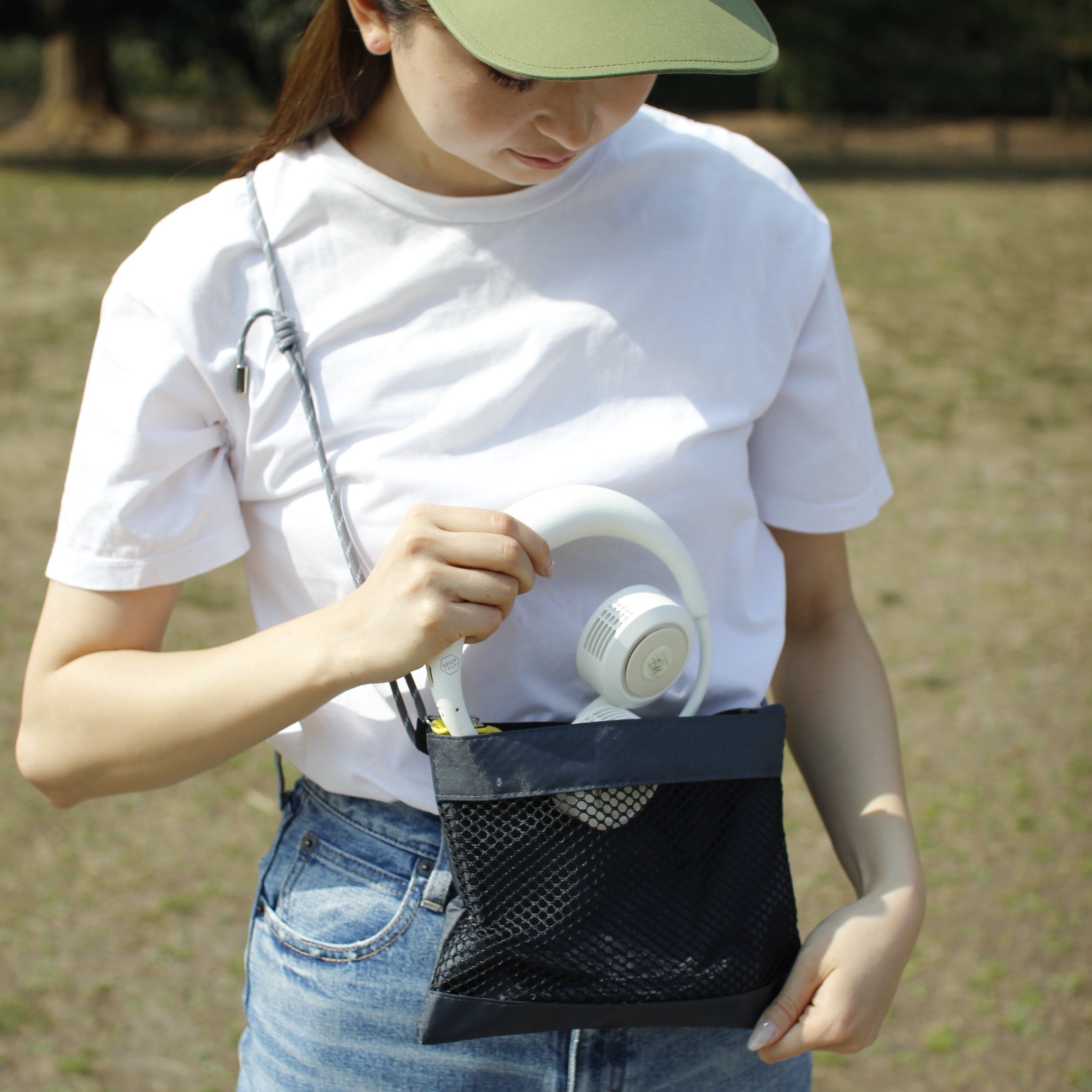 暑い時、暑い場所でいつでもどこでも、首掛け扇風機「ダブルファン」を持ち歩けるよう「サコッシュ」にセットしました。メッシュ素材のポケットにダブルファンを入れて、使いたい時にすぐに取り出せるようになっています。背面のポケットはスマホや貴重品など入れられるファスナー付き。これ一つで夏のお出かけが楽しく快適に過ごせます。