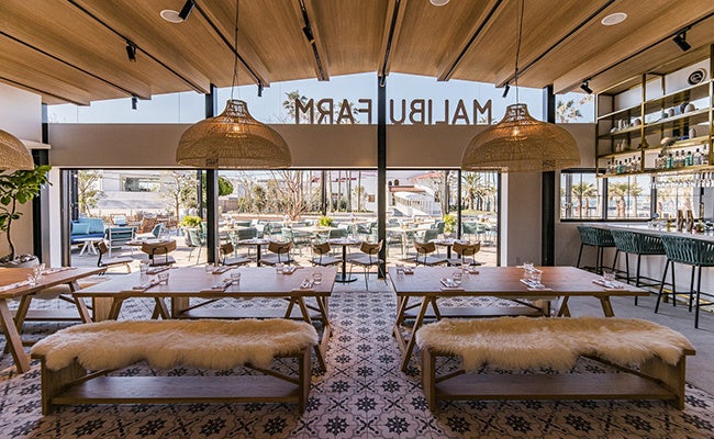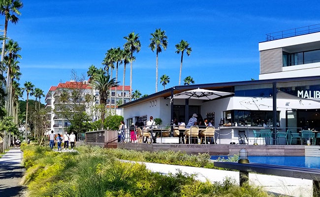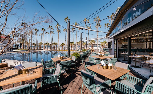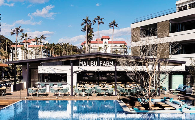 『マリブファーム 逗子マリーナ』では、現地の人気メニューの他、地元湘南の新鮮野菜や相模湾の魚介類を使用した日本限定メニューもご用意しています。全開可能なサッシによりテラス席と内部が一体となる設えで、約50席の屋内席の他、マリーナの海から繋がるような大きな水盤が広がる約80席のテラスには、三方を水に包まれたウォーターテラス席や、暖炉を囲むファイヤーテラス席などシチュエーションに応じてお使いいただけます。豊富なテラス席を有するため、ペット同伴でのお食事に最適なレストランです。