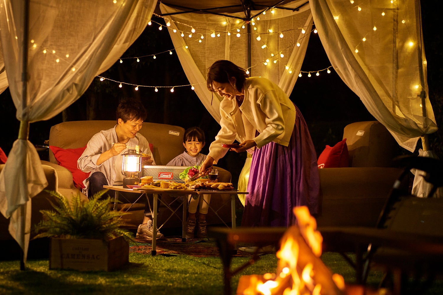 「コールマンラウンジ」では日々の暮らしの中でもキャンプを通じて得られる自然の恵みや、家族、友人とのつながりを感じることのできるキャンプスタイル「ホームチルキャンプ」を提案しています。難燃素材でカバーされた適度な反発性で快適な「エアカウチ」ほか、コールマン製品を中心として特別設置された森の中にラグジュアリー感あふれるプライベートな空間を演出しています。芝生の上にラグを敷き、まるでリビングのような寛ぎの中、昼間は青空の下で頭上を飛ぶダイナミックな飛行機、夜は星空を眺めながら自然のプラネタリウムをご覧いただけます。