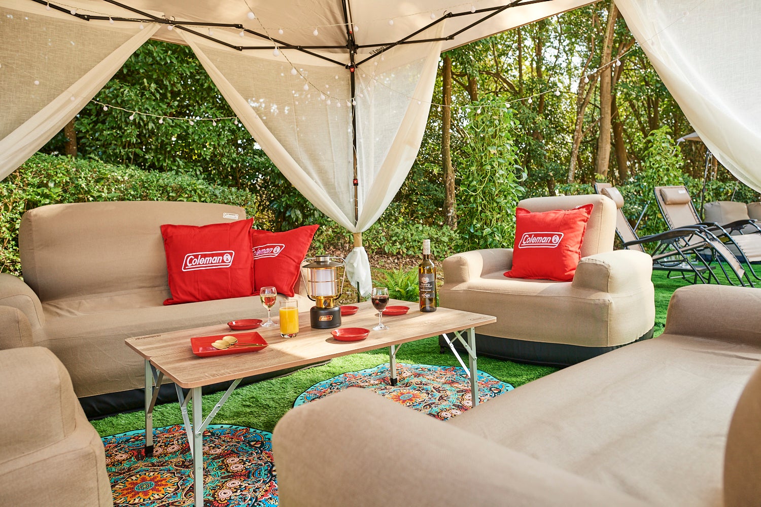 「コールマンラウンジ」では日々の暮らしの中でもキャンプを通じて得られる自然の恵みや、家族、友人とのつながりを感じることのできるキャンプスタイル「ホームチルキャンプ」を提案しています。難燃素材でカバーされた適度な反発性で快適な「エアカウチ」ほか、コールマン製品を中心として特別設置された森の中にラグジュアリー感あふれるプライベートな空間を演出しています。芝生の上にラグを敷き、まるでリビングのような寛ぎの中、昼間は青空の下で頭上を飛ぶダイナミックな飛行機、夜は星空を眺めながら自然のプラネタリウムをご覧いただけます。