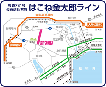 南足柄市と箱根町を連絡する道路(愛称:はこね金太郎ライン)は、南足柄市矢倉沢から箱根町仙石原までの約10.9kmを結ぶ道路で、自然環境への影響を極力少なくするため、大規模な改変は行わず、既存の林道を活用し、県道として乗用車等*1が安全に通行できるよう整備を進めてきました。今回の開通により、新たな道路ネットワークが構築され、災害時の代替ルートになるとともに、県西地域の観光振興をはじめとする地域活性化が期待されます