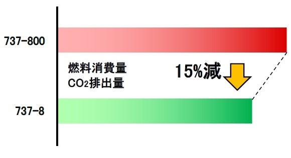 今回導入を決めたボーイング737-8型機は、737 MAXシリーズの機材の1つであり、燃費の向上したCFMインターナショナル社製の最新エンジンであるLEAP-1Bの搭載に加えて、最新鋭の翼端(アドバンスト・テクノロジー・ウィングレット)などにより、ボーイング737-800型と比較して燃料消費量およびCO2排出量約15%の削減が見込まれ、優れた経済性を有しています。