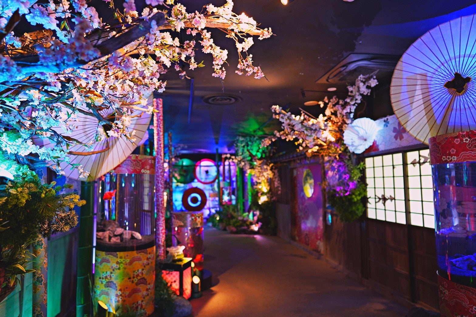 奈良金魚ミュージアムでは、年に4回季節ごとに装飾の変更を行っています。本企画では桜の花言葉「精神美」に準え、その美しさや切なさ、生命力の力強さなどを幻想的な空間と、希少とされる真っ白な「土佐錦」の展示で表現しました。