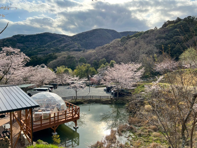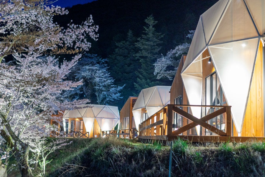 四季折々に表情をかえる木々に囲まれた大自然の中、都会の喧騒から離れ、心地よいそよ風を感じながら過ごす非日常を満喫するグランピング施設です。春の敷地内に咲き誇る60本もの桜と、深緑の緑に包まれ自然と一体となる春のアウトドア体験をお楽しみください。