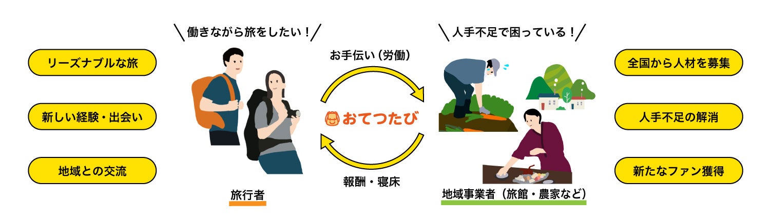 「お手伝い」と「旅」を掛け合わせた造語で、人手不足の事業者(ホテル・旅館など)と、旅先で働きながら旅を楽しみたいを旅行者をつなぐ人材マッチングサービスです。事業者は、旅を切り口にすることで全国各地から人材を集めることが可能です。旅行者は、交通費は自己負担となりますがお手伝いすることで報酬を得られ、宿泊費も無料のためリーズナブルな旅が可能です。