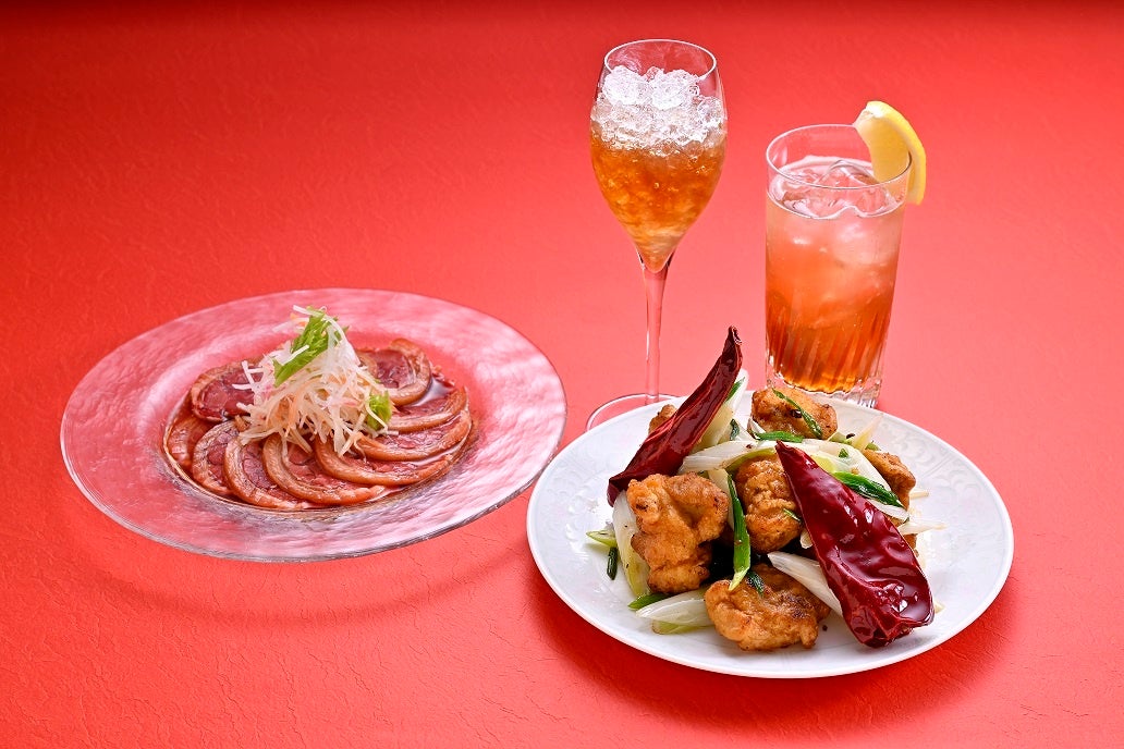 さらにお酒を美味しく味わっていただけるように、鴻臚 料理長の川村賢一が考案したペアリングフードメニューもご用意しています。ソーダとレモンでさっぱりとした「ドラゴンハイボール」には、お酒が進むピリッとした辛さが魅力の「鶏肉の唐辛子山椒炒め」を、甘めで飲みやすい「香港フィズ」には黒酢が効いた上品な味わいの「鴻臚オリジナル黒酢のスブタ」が相性抜群です。この機会に老酒の新たな魅力をご堪能ください。