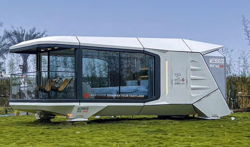 宇宙飛行船風にデザインされたハイテクノロジー、高品質、高性能の プレハブルーム製品。すでに中国各地でベンチマークとなって民宿プロ ジェクトの運営に活かされています。 一歩中に入れば、そこは従来のグランピングを超えた空間が!