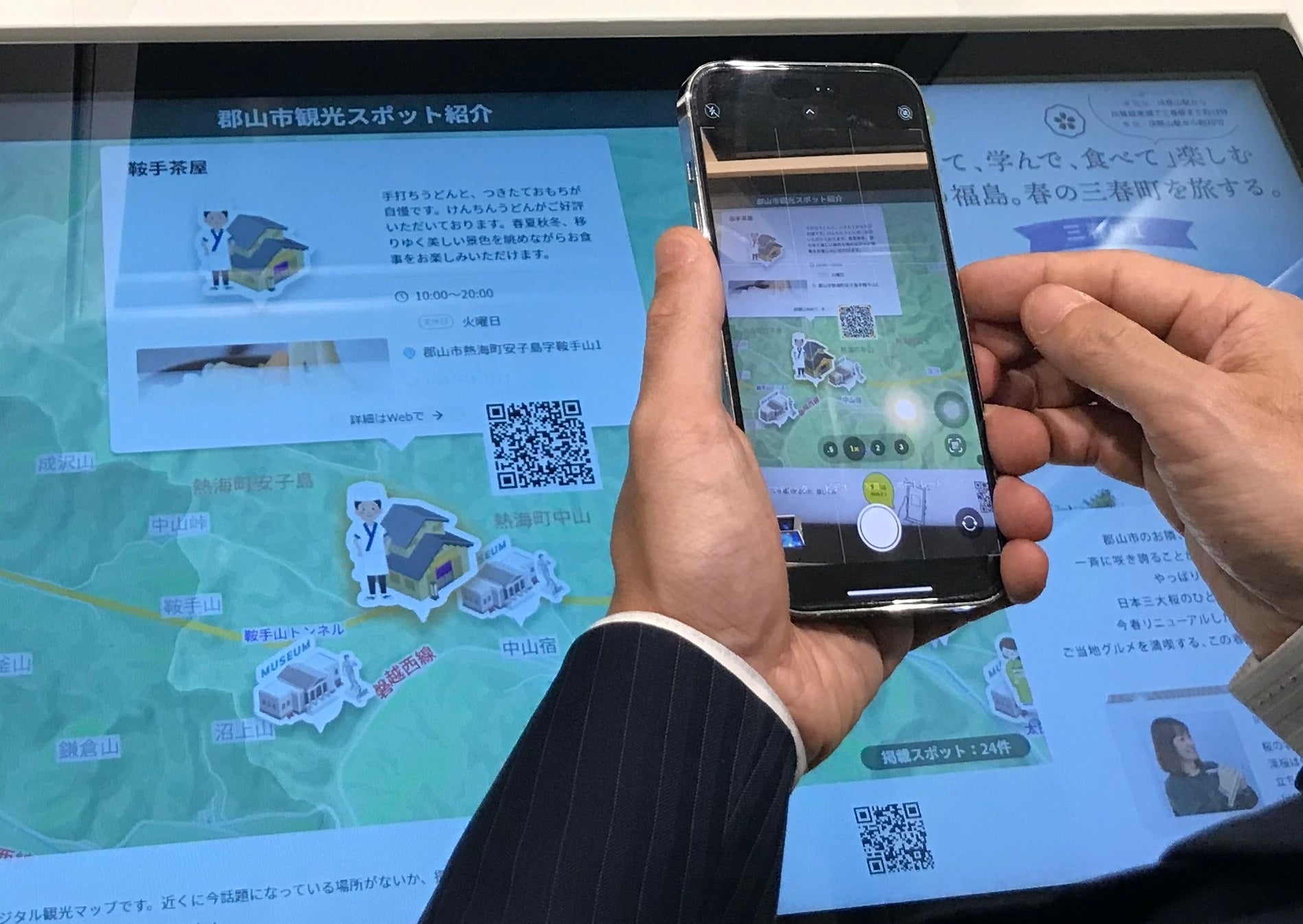 こうした課題解決の加速に向けて、DNPは今回、「こおりやま観光案内所」にデジタルサイネージを提供します。SNSの情報を画面の地図上にリアルタイムに表示する機能や、観光客等の利用者自身が情報を選択してスマートフォンで情報を「持ち帰る」仕掛けなどによって、地域の周遊を促進します。また、運用が容易なコンテンツ配信システムにより、案内所職員の業務負荷の低減につなげていきます。
