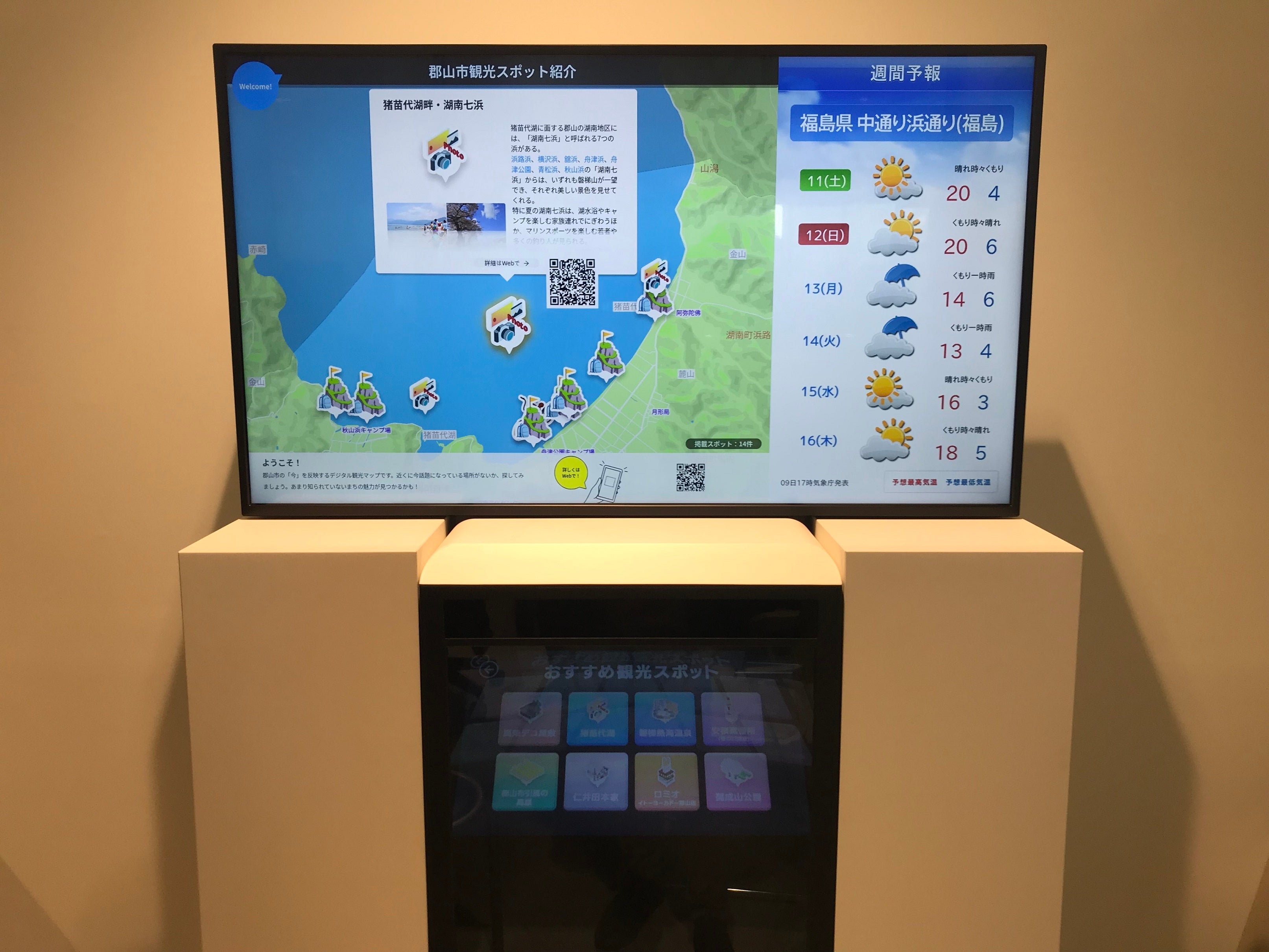 本サイネージでは、観光情報等を表示した地図のほかに、地域内の周遊に必要な「郡山市の天気予報」や「花粉・熱中症等季節の情報」などを提供します。また、緊急時の「緊急地震速報」や、物販等の観光プロモーションにつなげる各種コンテンツを配信します。