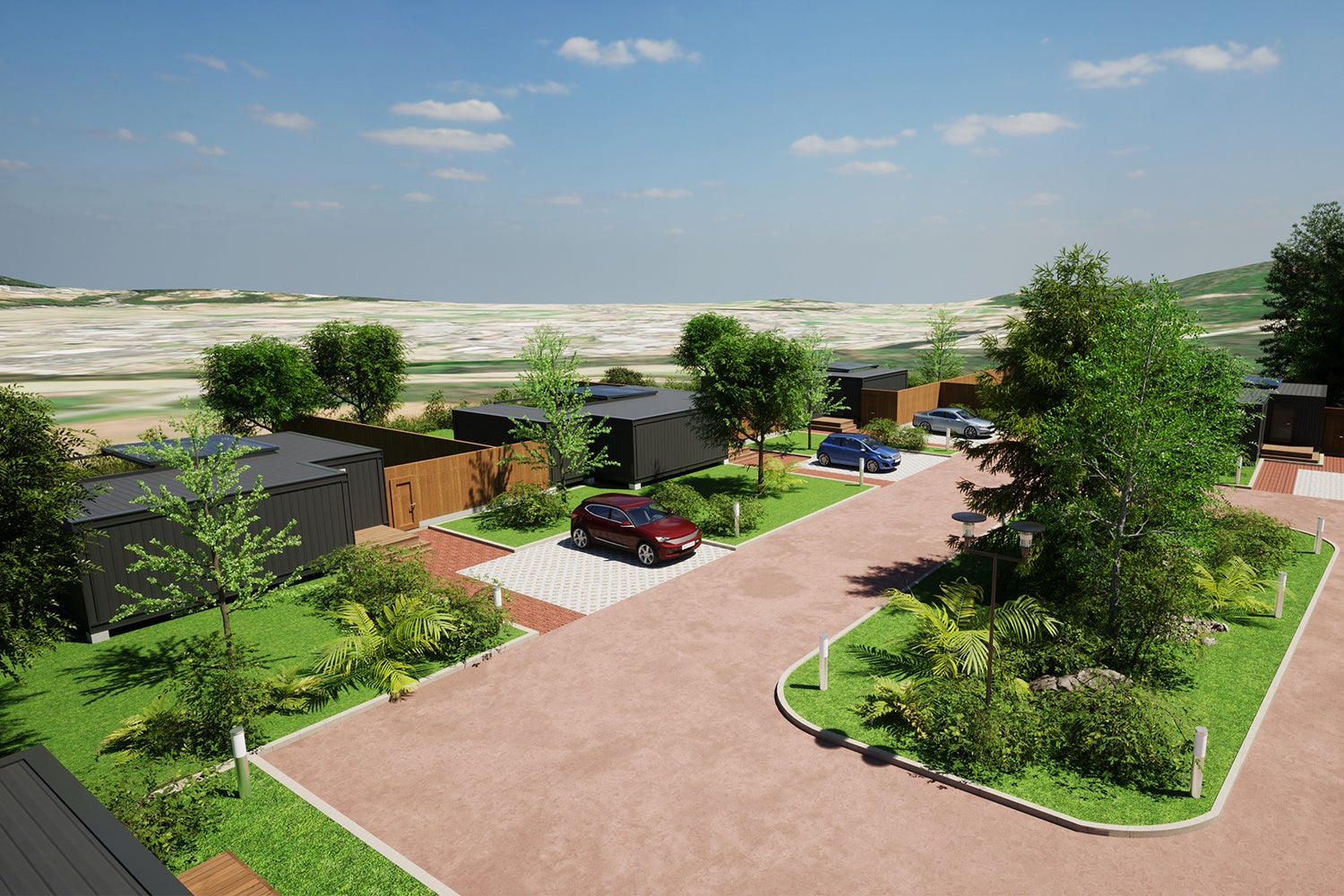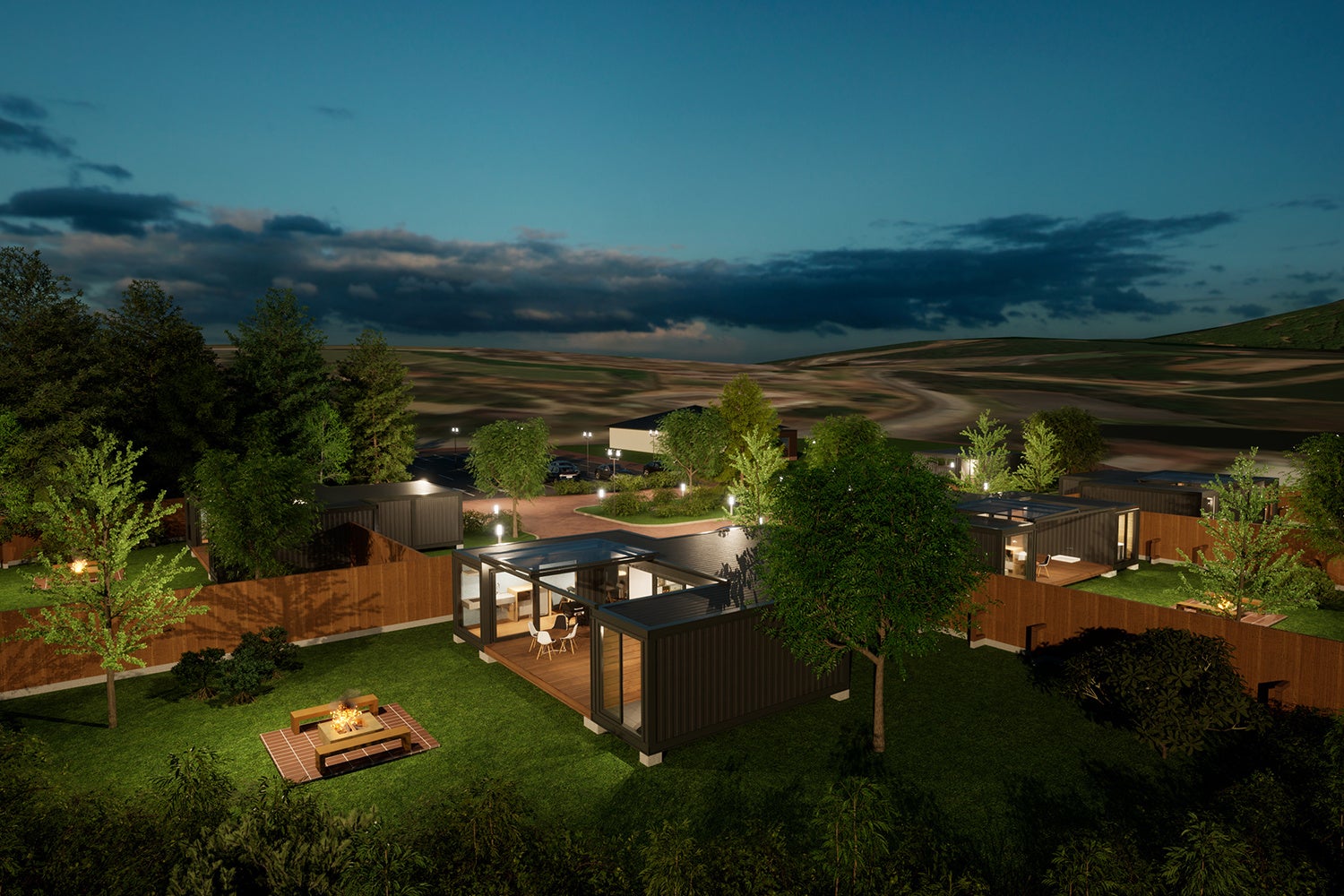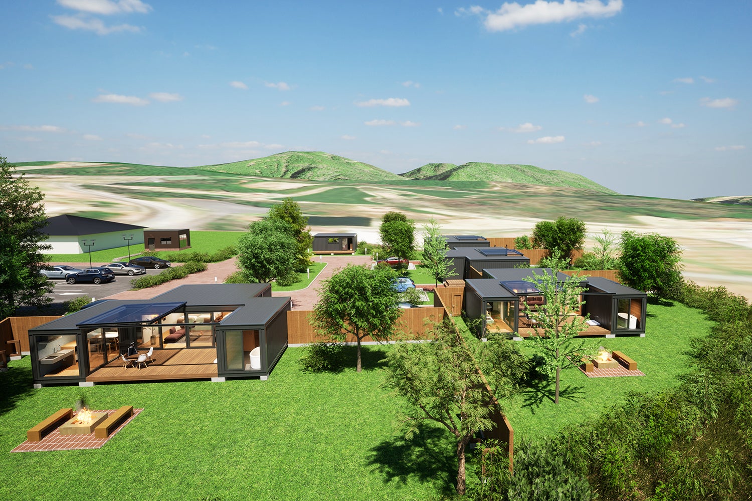 GLAMP CABIN-グランキャビン-安心院」はぶどう畑をのぞむ3,300㎡の広大な敷地にわずか4棟のみの贅沢な配置。全棟プライベートガーデンを有するスイートキャビンは一棟貸切タイプの完全プライベート空間。
