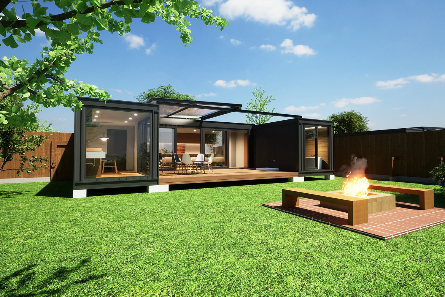 リビング兼寝室棟、キッチン棟、風呂棟どこにいても豊かな自然を身近に感じる開放感たっぷりの設え。爽快な開放感をお楽しみいただけます。