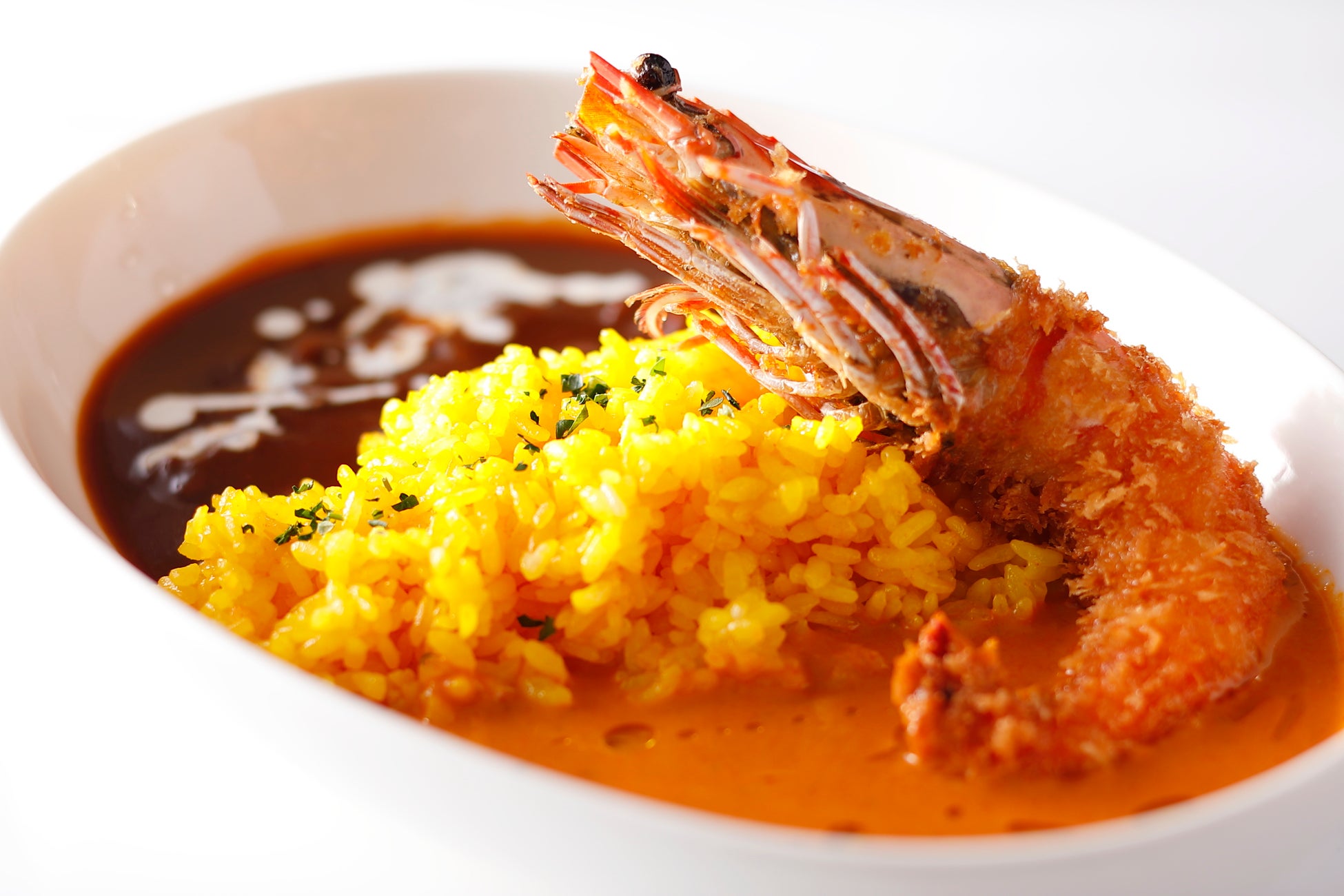 味の対比を愉しむカレーは、ココナッツミルクを使用したレッドカレーと、コニャックを隠し味に加えたビーフブラックハヤシ。ライスは白ライスと国産のサフランを使用したサフランライス。ココナッツと相性の良い海老は、まるごと海老フライで、香りと食感の”味変”を愉しんでいただけます。