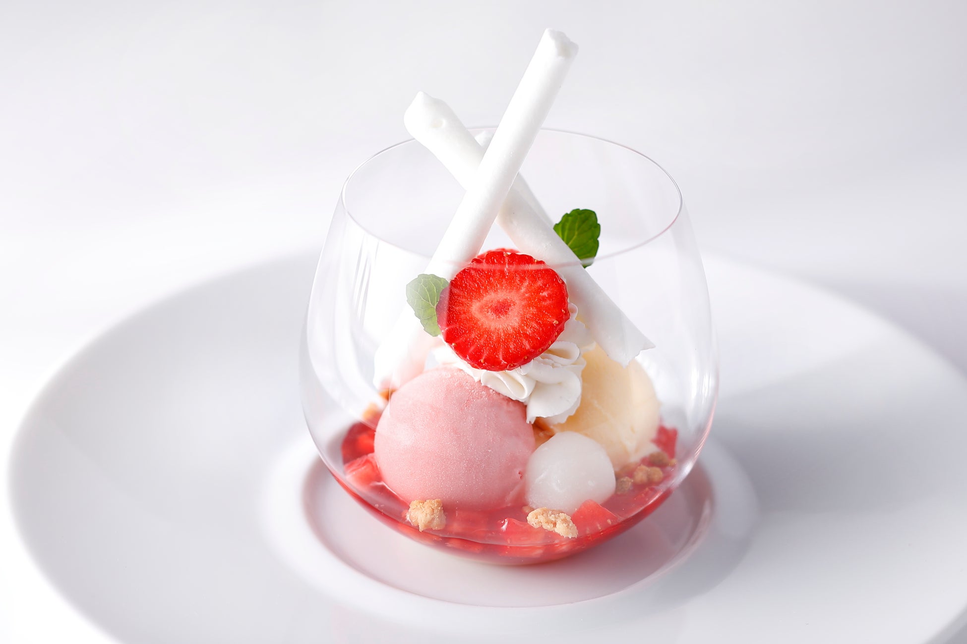 食後には、リニューアルオープン以来、好評をいただいている四ツ谷の老舗たいやき店 “たいやきわかば”の餡子を使用したいちごパフェ。ほどよい塩気のある餡子と甘酸っぱいいちごパフェには白玉も加わり、これだけ聞くと「フルーツあんみつ」のような食材たちが、ハレの日のお祝いにもおすすめなデザートとして登場いたします。まさに「新江戸洋食」を締めくくるにふさわしいデザートです。