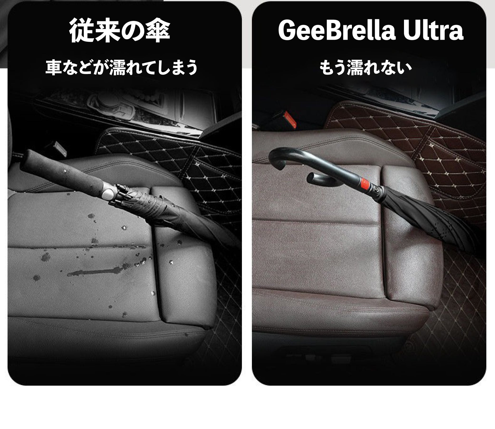 傘をたたんだ時に外側は一切濡れていないので、車内や室内に傘を持ち込んだ時にシートが濡れることはありません!