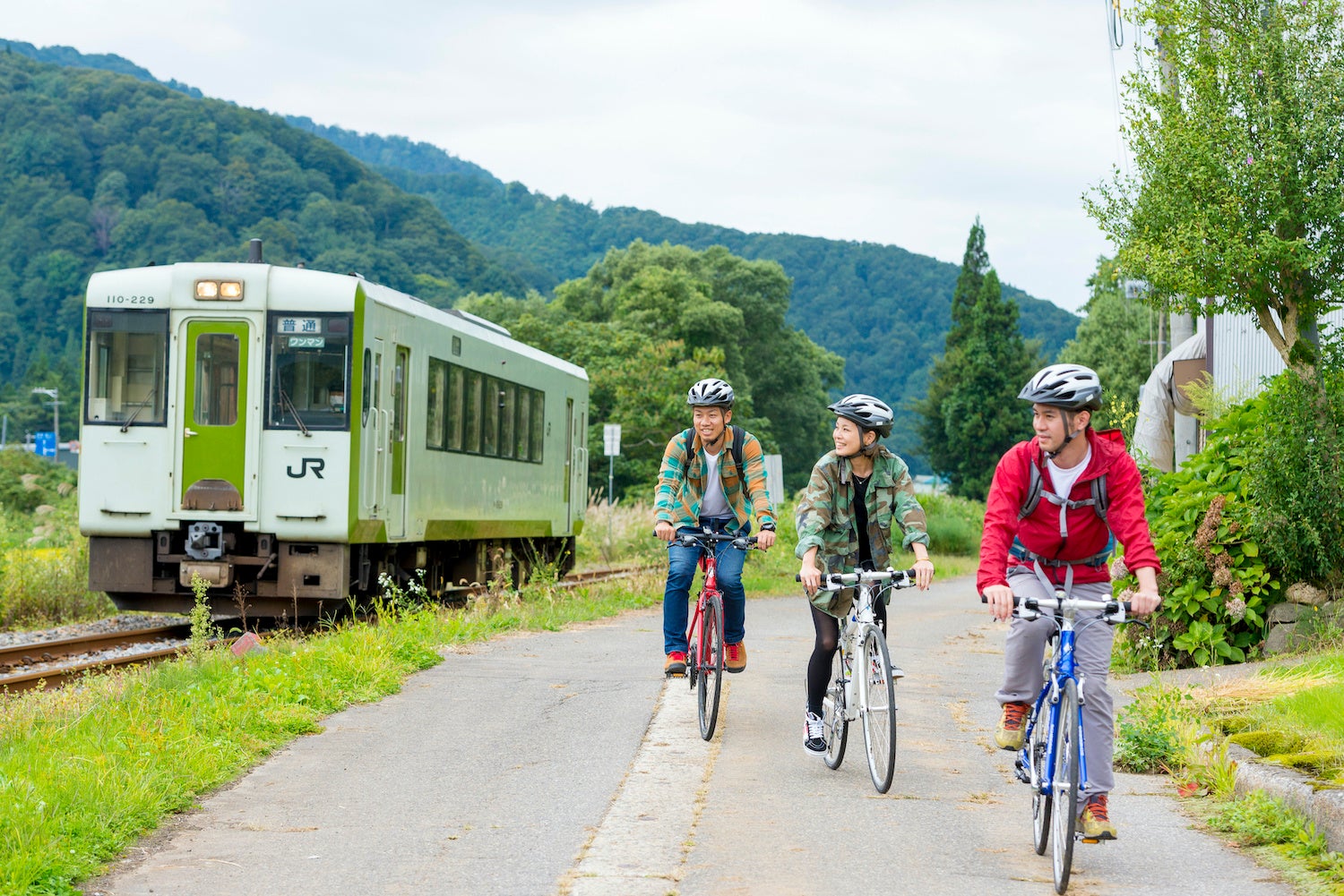 このコース最大のポイントは、レンタサイクルを乗り捨て(※別途料金)して、帰りはフォトジェニックなローカル線「飯山線」で帰ってくることができるワンウェイサイクリングができること!