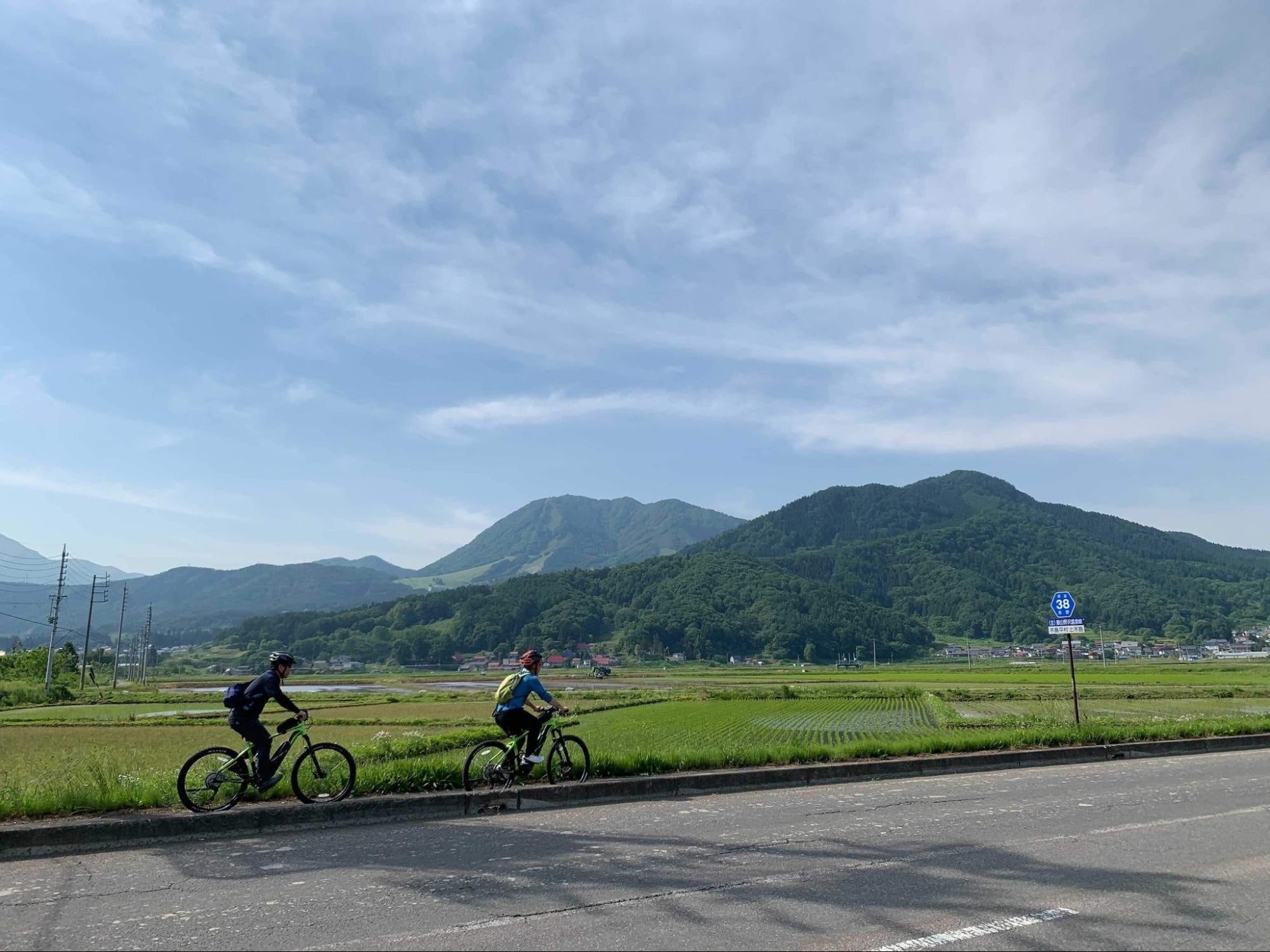 千曲川を渡り、のどかな田園風景を眺めながらゆったりと進むサイクリング。安全な道をサイクリングするのでファミリーにもおすすめ。
