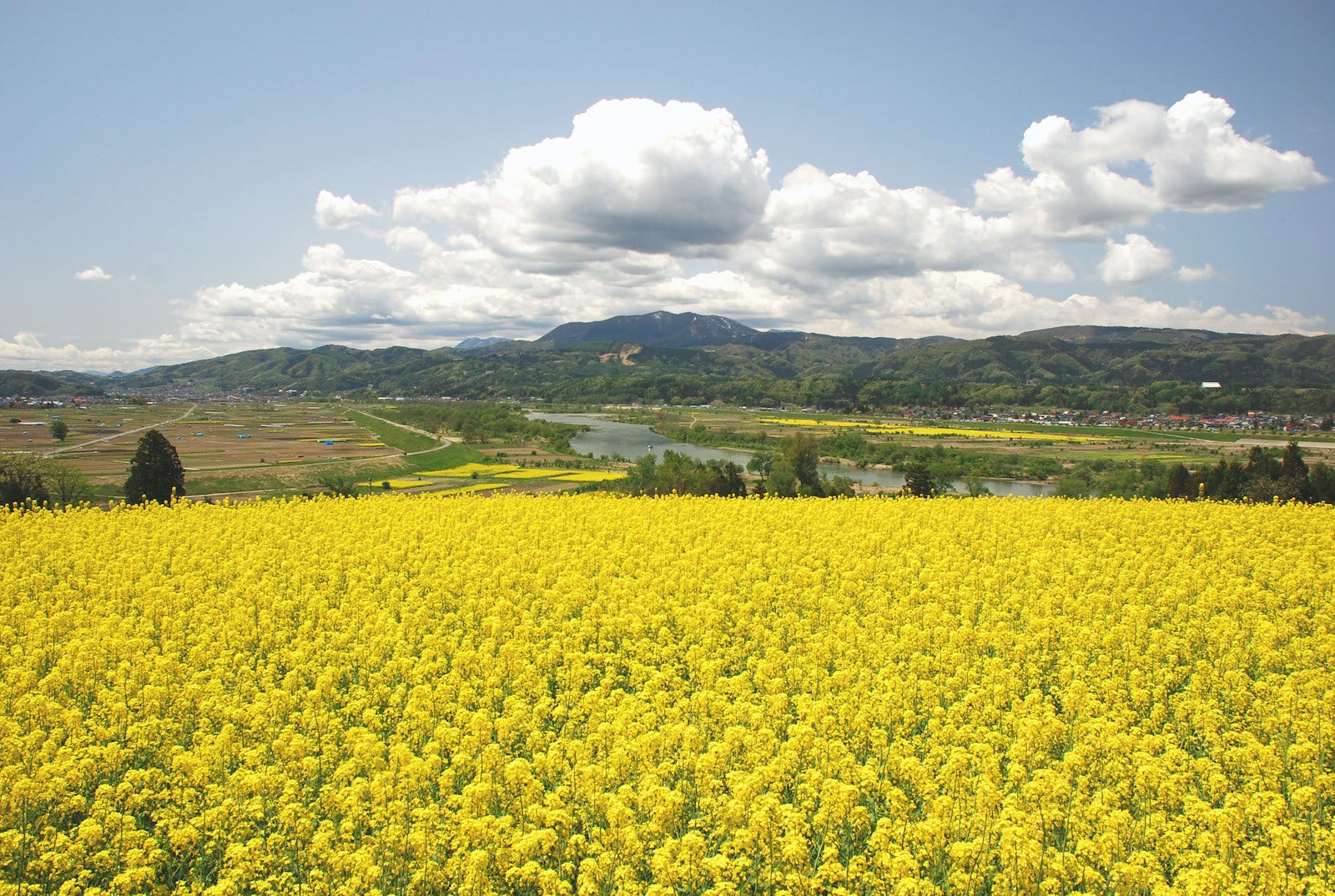 春の信越自然郷といえば、一面に菜の花が咲き、黄色い絨毯のようになる『菜の花公園』が人気の絶景スポット!