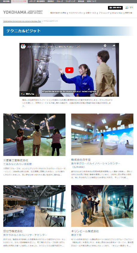 ページ上部には新規動画「DESTINATION YOKOHAMA -TECHNICAL VISIT-」も掲載。 みなとみらいエリアを中心に横浜を代表する企業4社を紹介。(今後、段階的に企業を増やす予定。)
