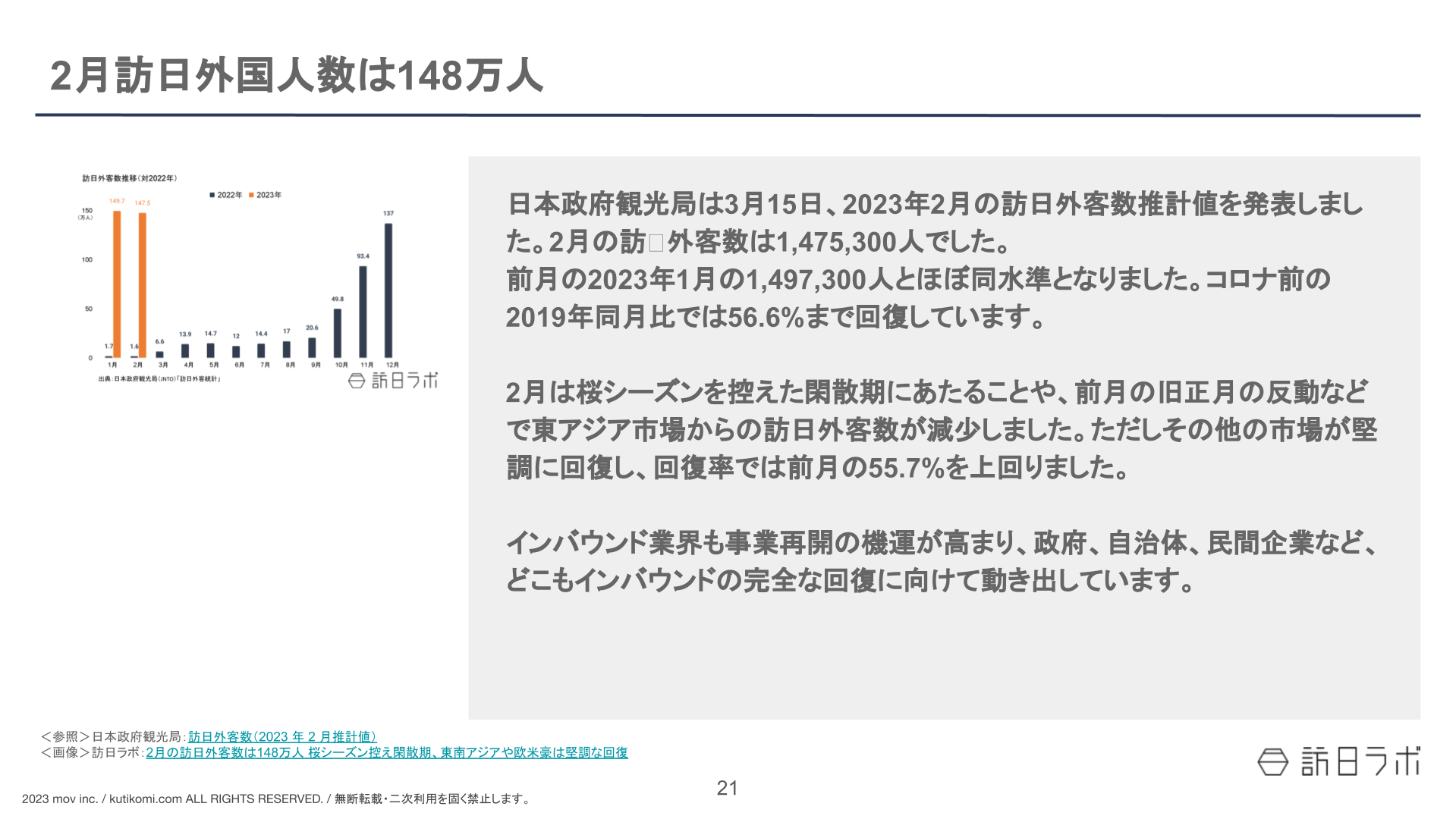 国内最大級のインバウンド総合メディア「訪日ラボ」を運営する株式会社mov(代表取締役:渡邊 誠、本社:東京都渋谷区、以下mov)は、「インバウンドに関連する政府&自治体などの取り組み」「各国の出入国の動向」を始め、インバウンド対策に役立つニュースをまとめた「インバウンド動向まとめ【2023年1月〜3月版】」を公開しました。