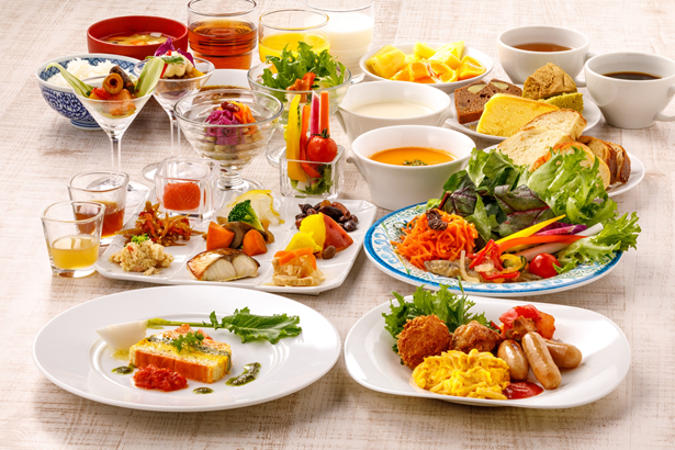 2階の朝食会場では、主に地元食材を使った和洋食ビュッフェを提供します。㈱グラノ24Kオリジナルのパンをはじめ、野菜を使ったスープやテリーヌなど素材の味を活かした料理をご準備しております。