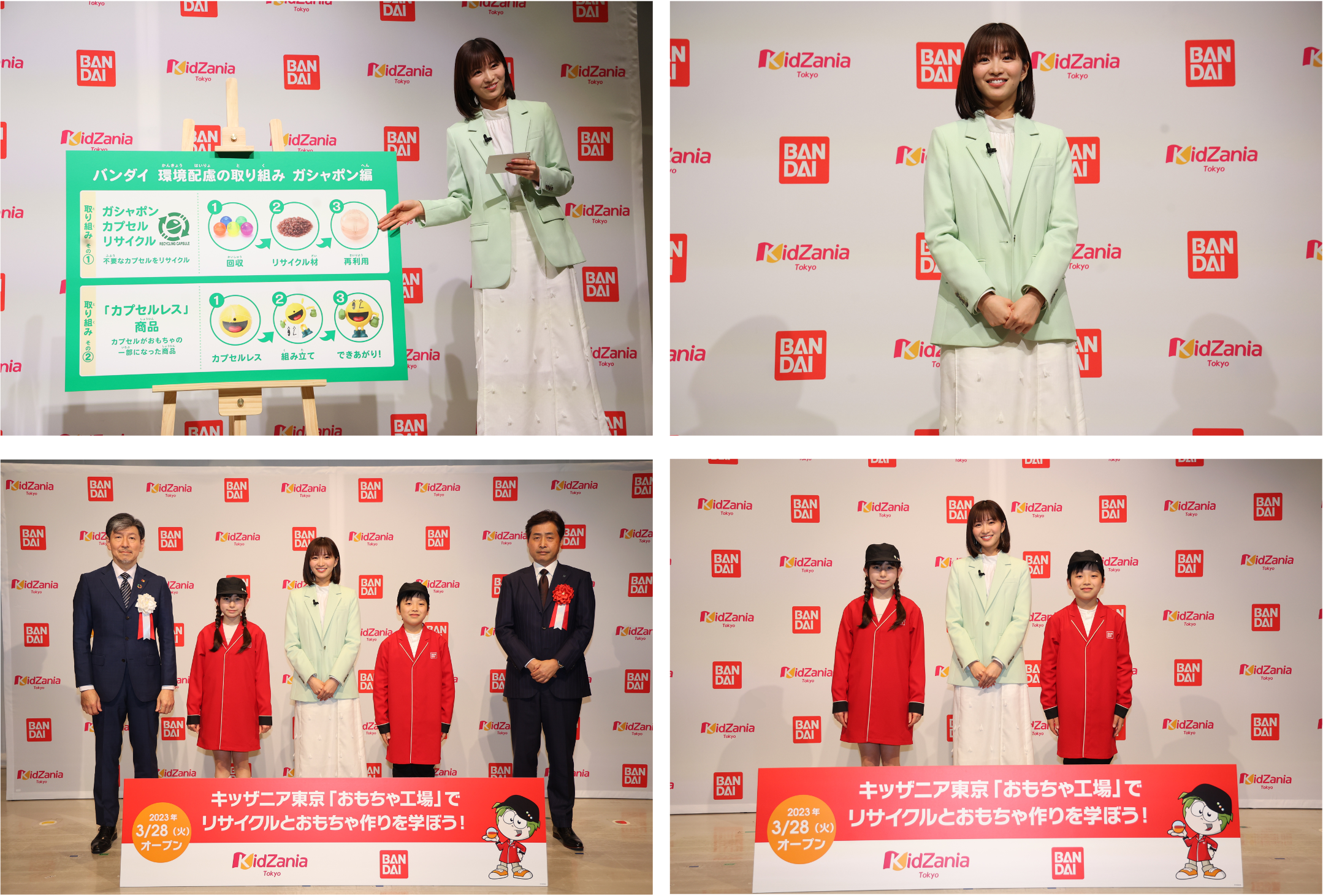 株式会社バンダイ(本社:東京都台東区、代表取締役社長:竹中 一博 )は、KCJ GROUP 株式会社(本社:東京都中央区、代表取締役社長:圓谷 道成)が企画・運営を行うこどもの職業・社会体験施設「キッザニア東京」(東京都江東区)において、バンダイがオフィシャルスポンサーをつとめる『おもちゃ工場』パビリオンを、2023年3月28日(火)にオープンしました。本パビリオンは、3月2日にバンダイ・BANDAI SPIRITSが発表したサステナビリティプロジェクト『未来・クリエイション』の目標のひとつである「未来を担う子どもたちに向けた教育・体験価値の提供」に準じた取り組みです。つきましては、プロジェクトのアンバサダーである俳優の岡崎紗絵さんにもお越しいただき、オープニングセレモニーを開催しました。