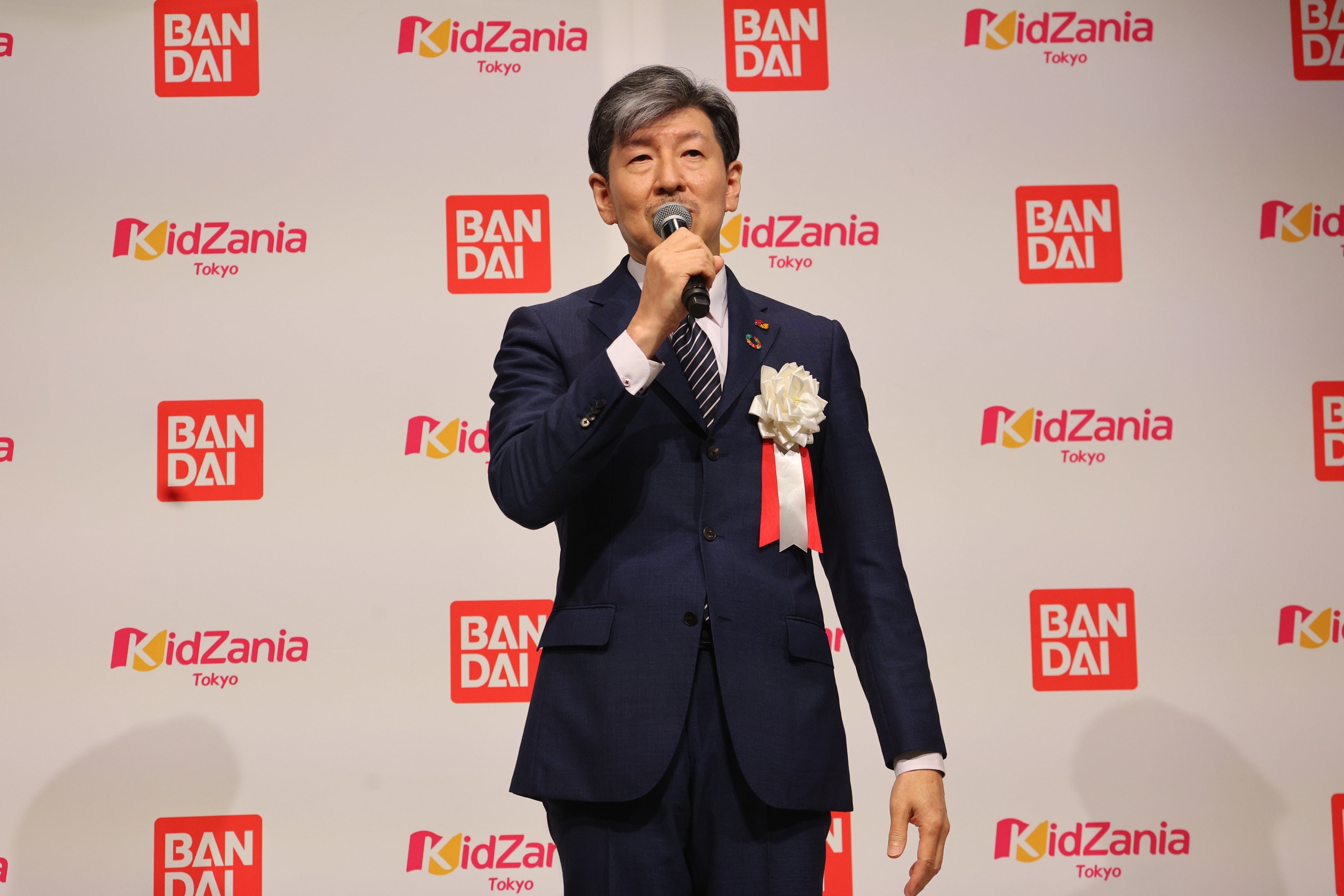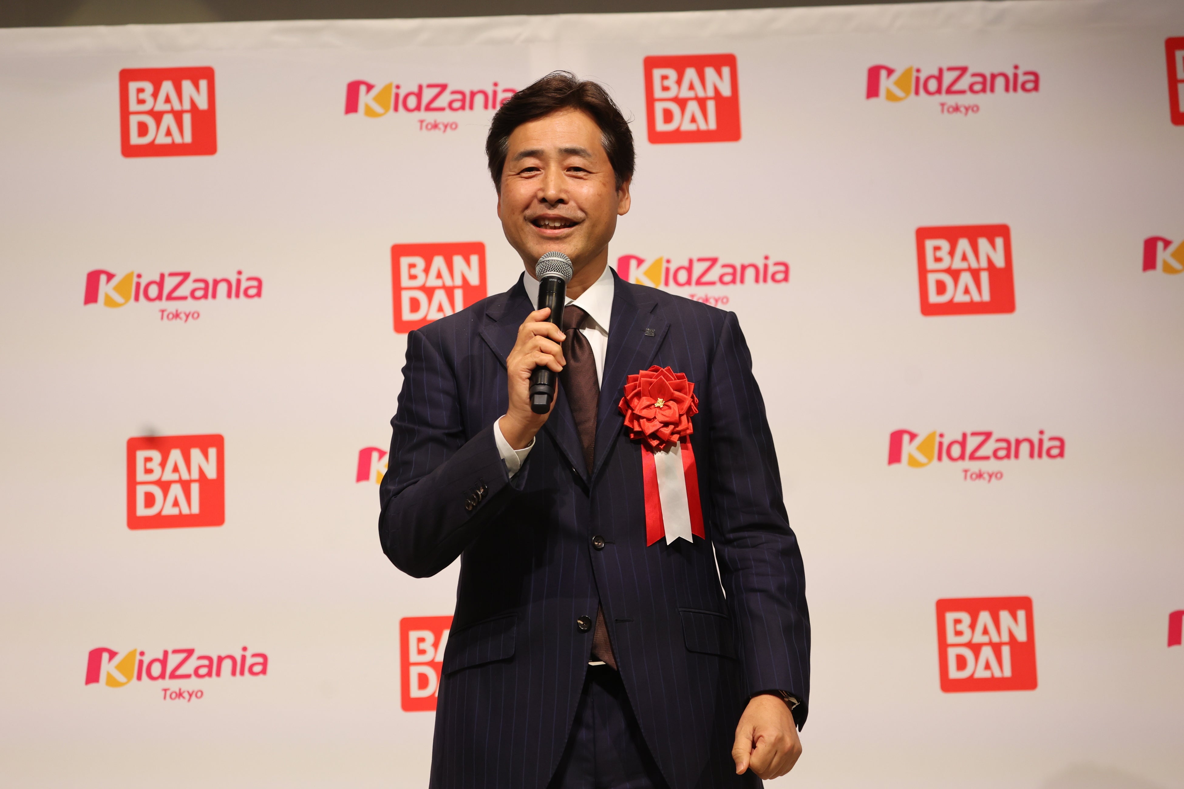 次に、 KCJ GROUPの圓谷社長が登壇し、「バンダイはエンターテインメントの業界でリーディングカンパニー。私も子どもの頃からバンダイのグッズに触れてきたし、今の子どもたちも同じだと思う。そうした使う側の体験から、実際にどのように作っているのか、考えているのかなど、作る側の立場を体験できるのがキッザニアならではになります。おもちゃの楽しさを感じること、工程を学ぶこと、両方を兼ね備えたものになれば嬉しい」と話しました。