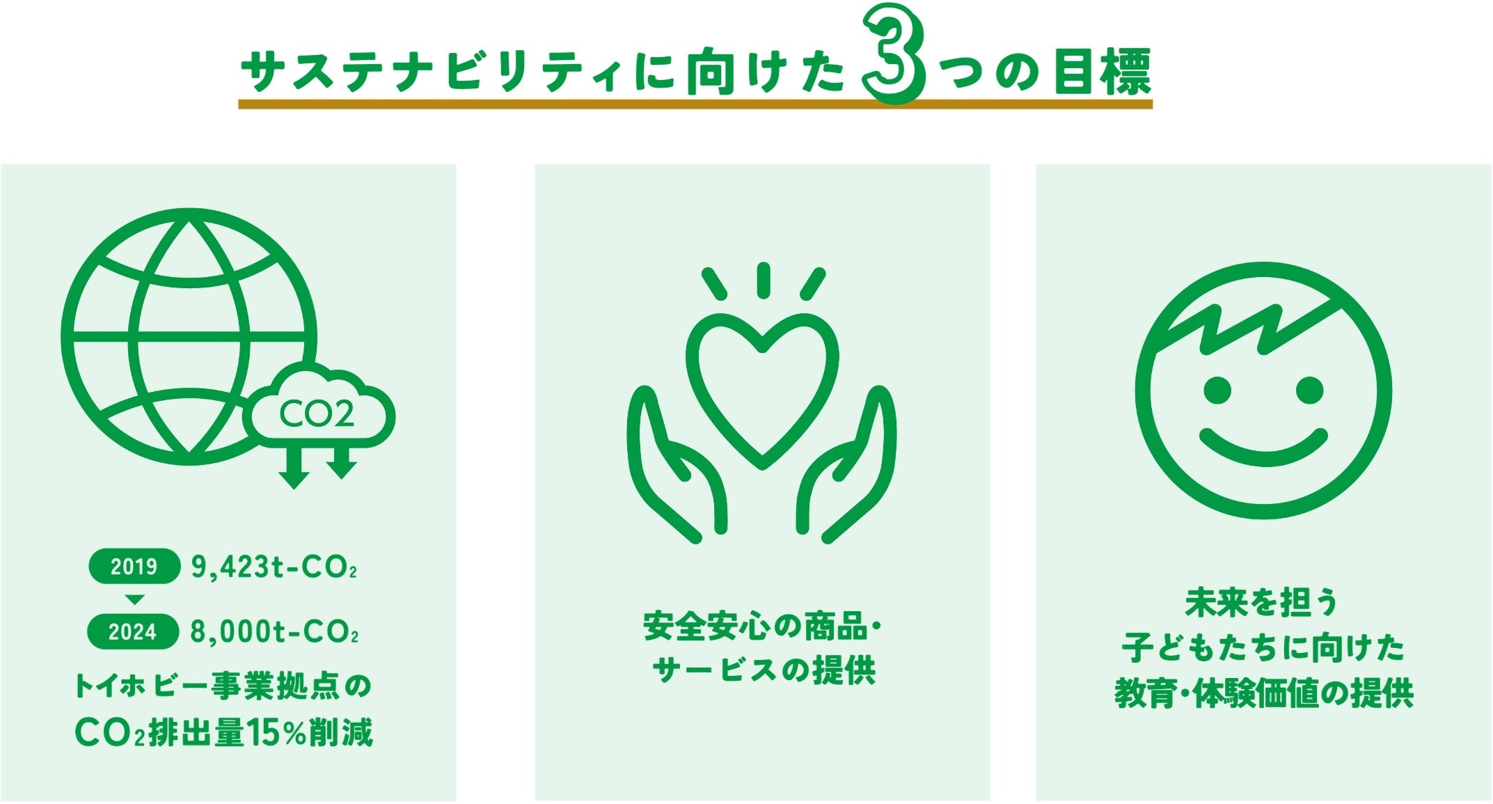 『未来・クリエイション』の3つの目標は、「トイホビー事業拠点のCO2排出量15%削減」「安全安心の商品・サービスの提供」「未来を担う子どもたちに向けた教育・体験価値の提供」です。これらを実現するために、「会社」「部門」「役員・社員」のレイヤーに分けて、それぞれがやること・できることを定めています。