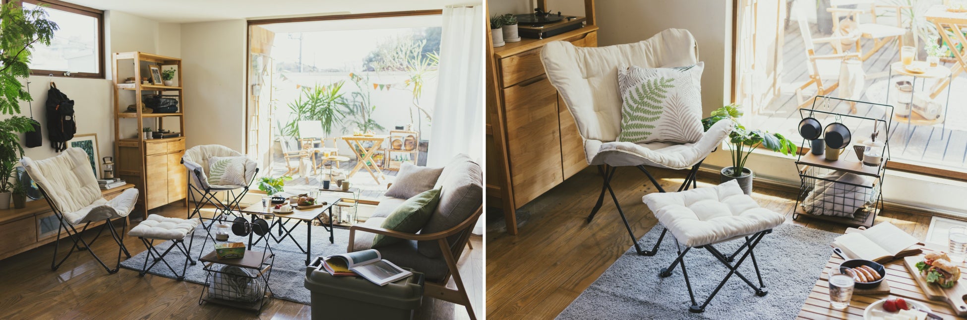 ①バタフライチェアのオットマンとして使えば、よりリラックスして過ごせます。