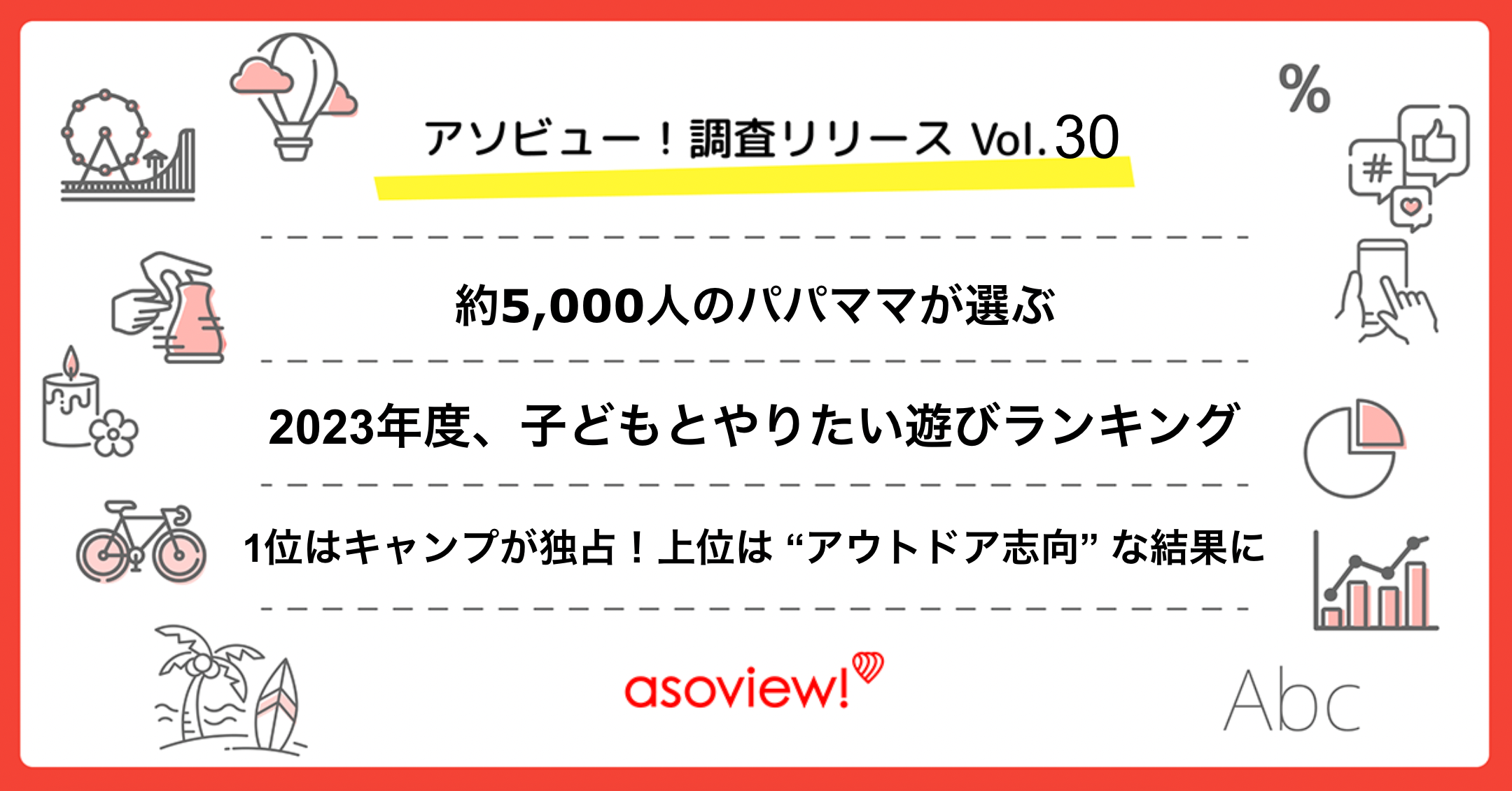 休日の便利でお得な遊び予約サイト「アソビュー!」(URL:https://www.asoview.com/、以下:アソビュー!)を運営するアソビュー株式会社(所在地:東京都品川区、代表執行役員CEO:山野智久、以下、当社)は、15歳以下の子どもがいるアソビュー!会員(n=4,998)に「新年度、子どもとやりたい遊び」についてアンケートを実施しました。その結果を「新年度、子どもとやりたい遊びランキング」として発表するとともに、子どもと体験する遊びを選ぶ際に重視するポイントについての調査結果も合わせてご紹介します。