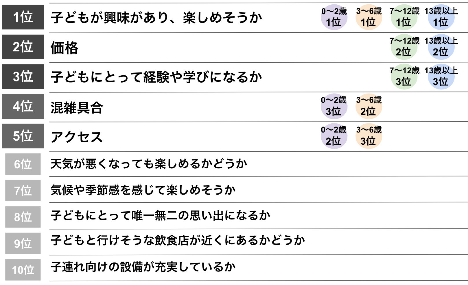 2位以降は、子どもの年齢別で見ると、順位が入れ替わる結果となりました。6歳までの子どもを持つ家庭では「価格」よりも「混雑具合」や「アクセスの良さ」を重要視しており、子どもを遊ばせる際に “手軽さ” や “快適さ” がポイントになっていることがわかります。一方で、7歳以上の子どもを持つ家庭では、2番目に多かった回答が「価格」となりました。年齢が上がるにつれて、施設の利用料が上がることも要因と言えます。3番目には「子どもにとって経験や学びになるか」が重要視されており、子どもの年齢が上がるにつれて 、遊びを選ぶ際には “学び” や “経験” といった点も着目されていることがわかります。