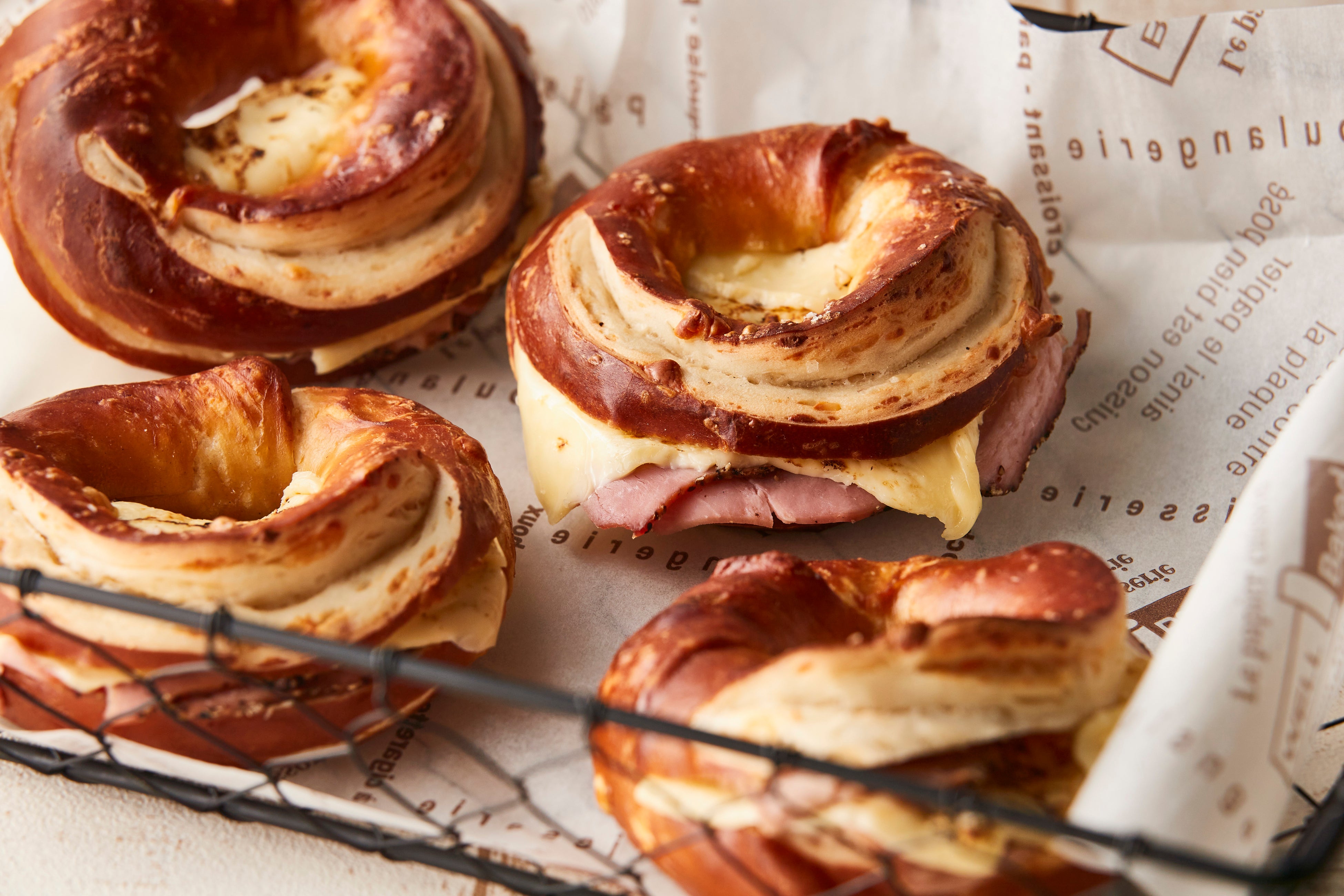 QBB「高たんぱく質&減塩カットチーズ」を練り込んだ歯切れの良いプレッツェルに、ハムとQBB「スライスチーズ鉄分・カルシウム入り」を挟みこんだ、栄養プラスの朝サンドです。販売価格:300円(税込)※1日限定20個販売
