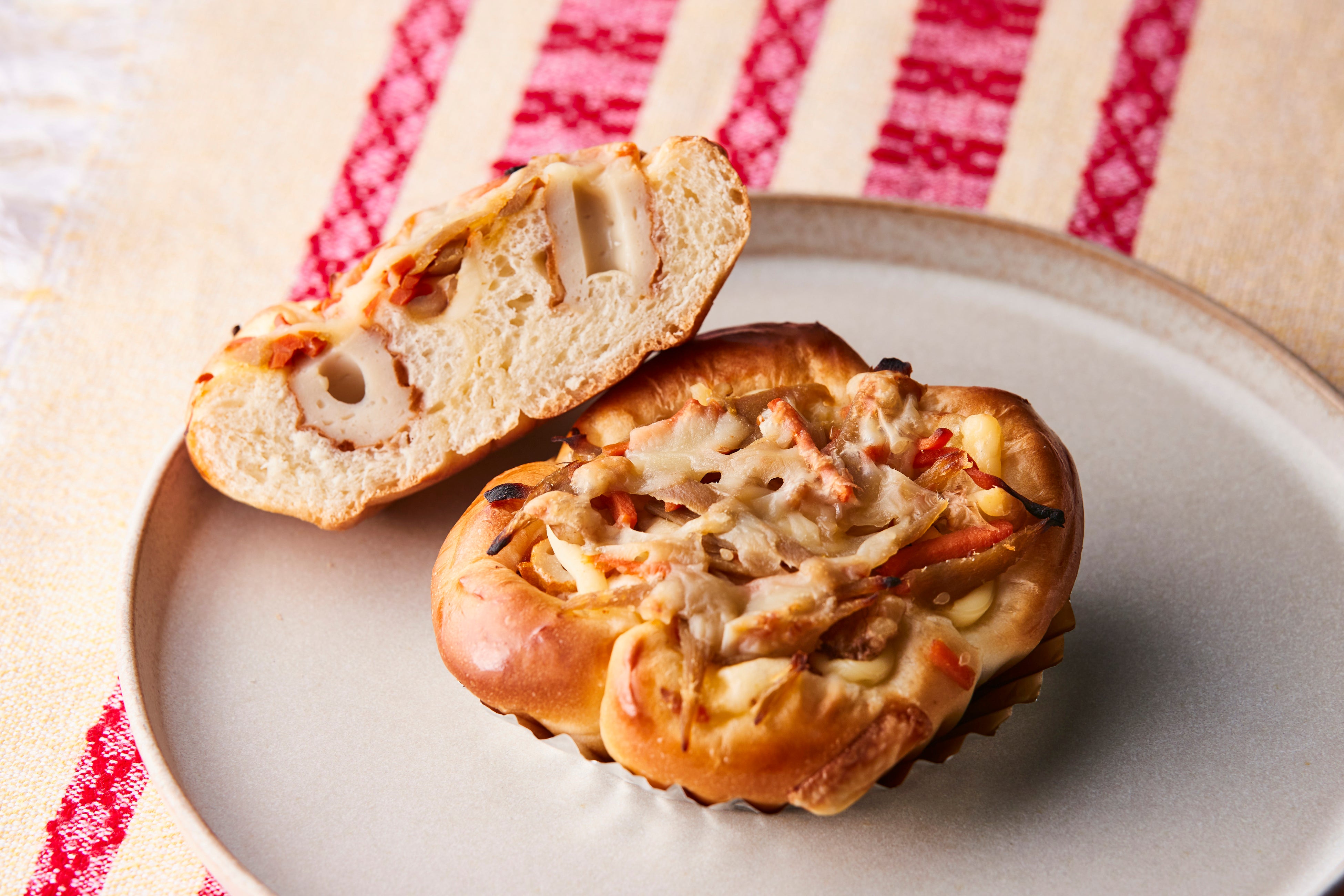 カネテツ「珍比良」(ちくわ)を使用し、きんぴらごぼう、クルミ、2種のチーズをトッピング。1つ食べれば朝から栄養盛りだくさんのパンです。販売価格:226円(税込)