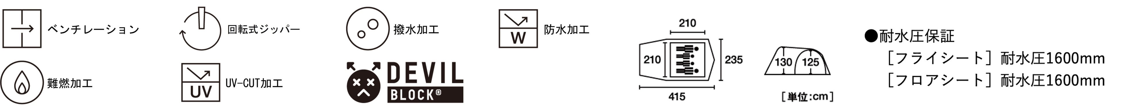 | 耐水圧 :[フライシート]1600mm[フロアシート]1600mm 主素材 :[フレーム]グラスファイバー[フライシート]難燃性ポリタフタ [インナーテント]ポリタフタ[フロアシート]バルキーポリ[メッシュ]デビルブロックST(インナードア) |