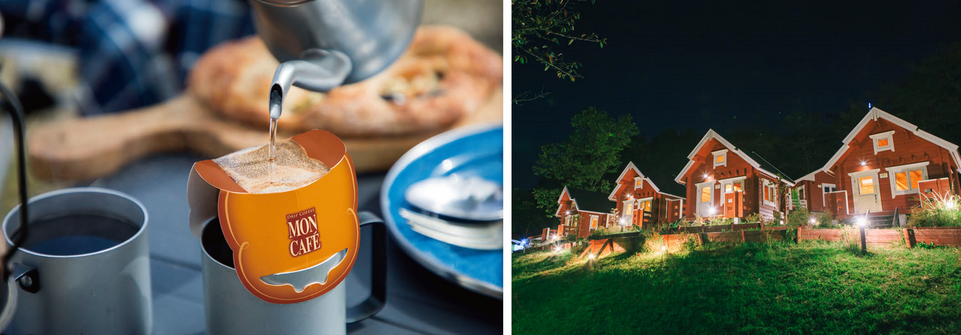 キャンプ場内の西側に位置する見晴らしの良いエリアの人気コテージ「TAKIBI」に宿泊される方、先着100組の方にモンカフェ6種セットと、先着200名様にモンカフェ×PICAさがみ湖 オリジナルマグをプレゼントいたします。コテージ内のケトルもコーヒーをドリップするのに最適な注ぎ口が細いケトルにグレードアップ。日々の喧騒を離れて、清々しい自然を独り占めするモンカフェタイムで、自分だけの「余白」時間をお楽しみください。