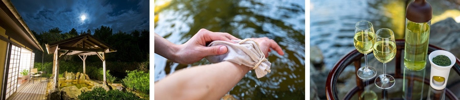 「松泉宮」の貸切温泉「離れ湯」にて、「新緑園」の緑茶パックを浸した緑茶露天風呂をお楽しみいただけます。「松泉宮」はミネラル豊富な美人の湯。カテキンやビタミンCが含まれる緑茶パックでお肌を優しくマッサージすれば、さらに健康的に美肌へと導いてくれます。東屋には「新緑園」の水出し緑茶と茶香炉をご用。お茶の香りに癒されながら、湯上りの爽やかな1杯をご堪能ください。