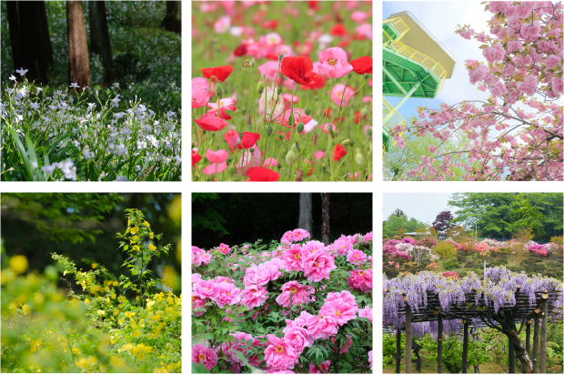 柔らかな春の日差しが降りそそぎ、森の中では100万株のシャガがキラキラと輝いて、白い絨毯が広がっています。バラテラスではカラフルなポピーが花の川のように流れ、ヤマブキやフジ、ボタンなどさまざまな花が咲き、春色に包まれる季節を迎えました。
