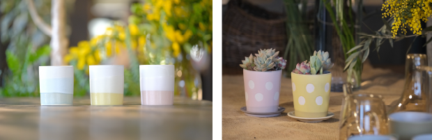 入園無料エリアにあるローズファーム マーケットでは、季節の花や植物をはじめ、園内のバラを使った香りのいいオリジナル商品や県内の名産品までハイセンスな商品を多数取り揃えています。この春のおすすめは、優しいパステルカラーで、新生活にぴったりなラインナップを取り揃えた笠間焼の陶器たち。石岡に隣接する笠間は、関東でもっとも歴史の古い焼き物産地として有名です。