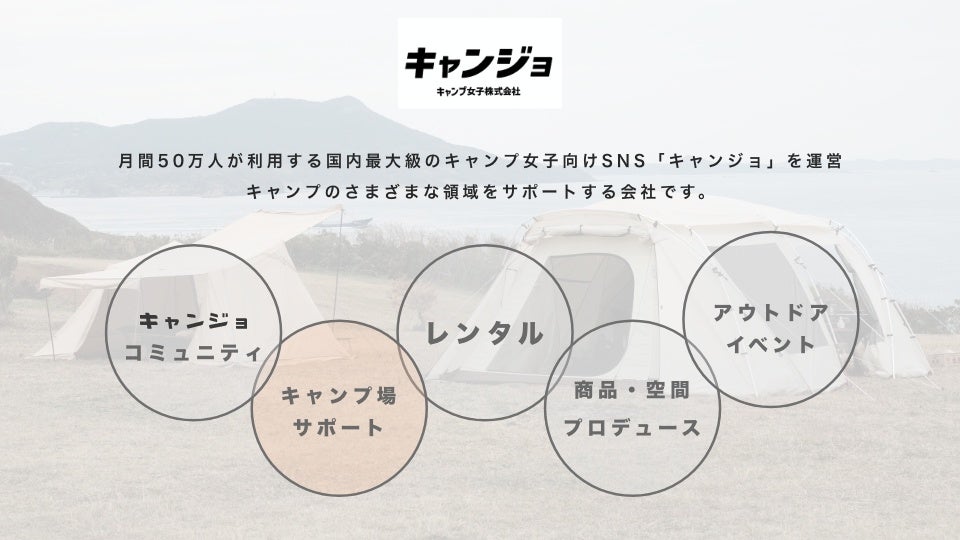 キャンプ女子SNSメディア「キャンジョ」や、キャンプ道具レンタル「福岡キャンプレンタル」、キャンプ場向けコンサルティングサービス「キャンプパートナーズ」などを運営する自然体験を通してより輝く人生を応援するアウトドアクリエイションカンパニーです。